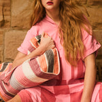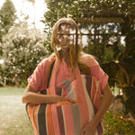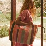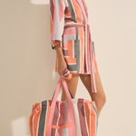 The Hydra Tote is crafted from the new vibrant Fira Stripe , featuring quilted stitching and a lightly padded design. With a top zip closure, an outside patch pocket for easy access, and an inside zipped pocket for valuables, it combines style and functionality. Colourful and playful, this oversized tote is the perfect beach bag or weekender travel companion.