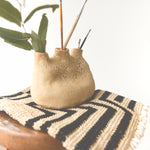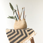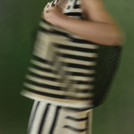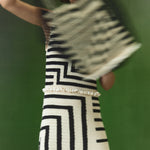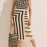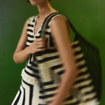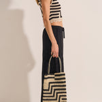 The Icarus Chambira Tote in black and white features an asymmetrical stripe design, handwoven and adorned with seashells. Made from Chambira, a palm native to the Amazon Rainforest, it showcases exceptional Peruvian craftsmanship. The fibre is naturally dyed with local plants and hand-crocheted for a unique finish. Perfect as a statement piece with jeans or paired with the Calais Top or Camilla Dress for a coordinated look.