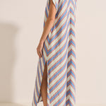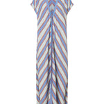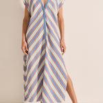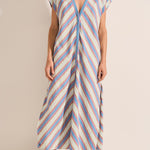 The Cythera Caftan is a new ILIO NEMA silhouette, featuring this season's bold Mykonos Stripe in blue, pink and gold accents. With a flowing bias cut, rolled sleeves, deep neckline, high side slits and side pockets, it offers both femininity and simplicity. Fully buttoned down with signature gold buttons, it can be worn as a dress or opened as a stylish beach cover-up—making it a timeless, versatile piece for every season.