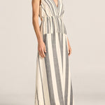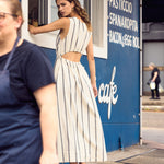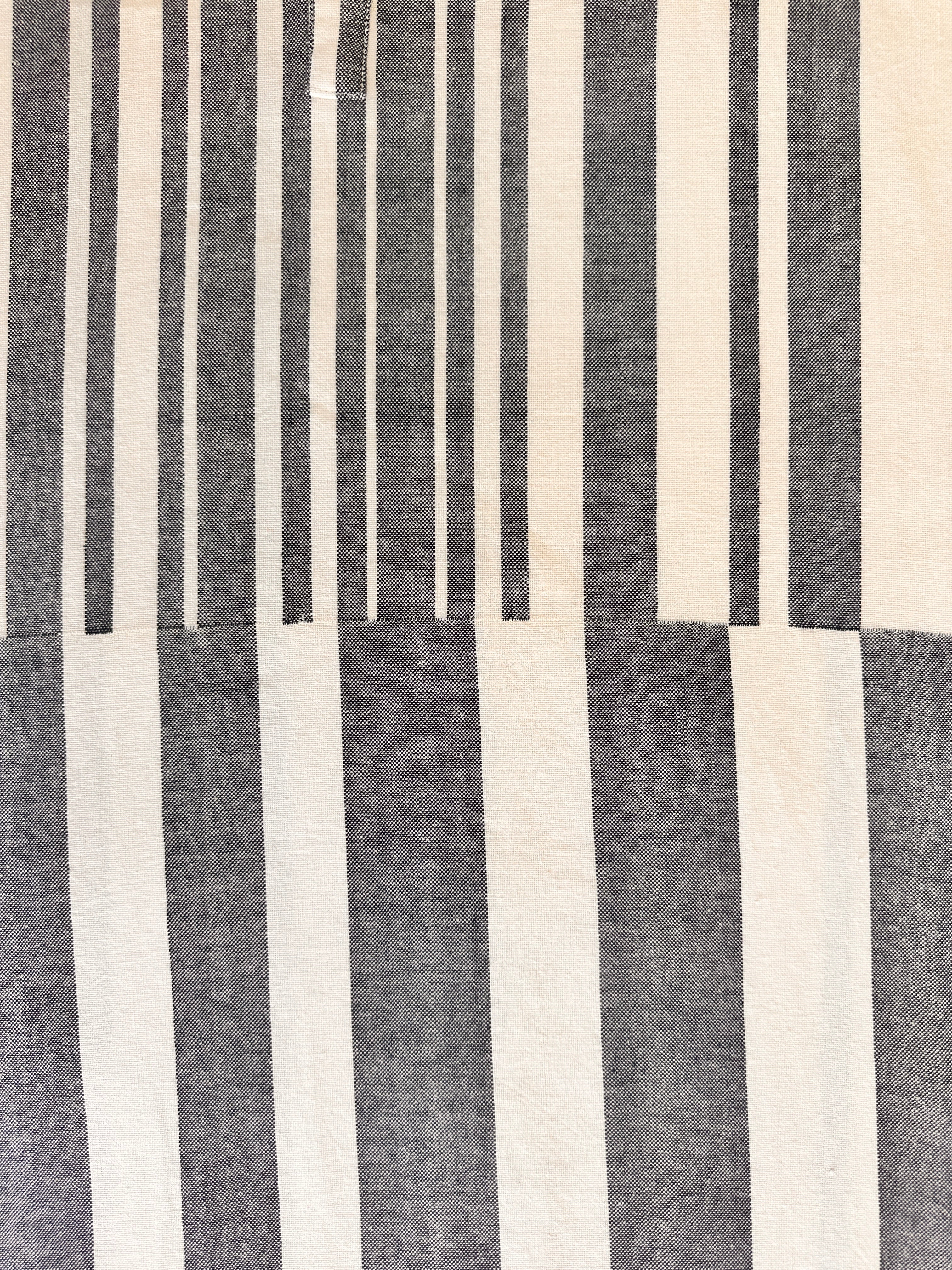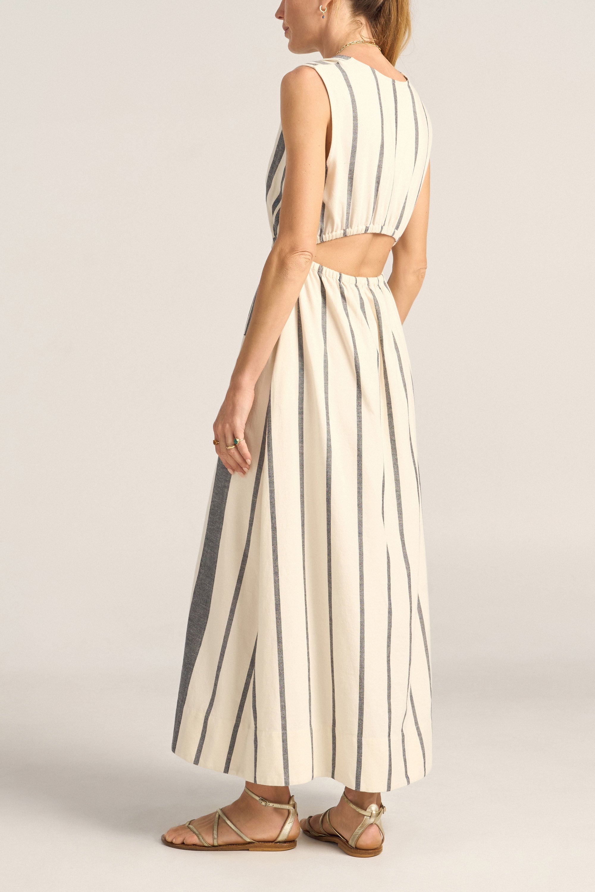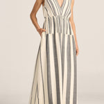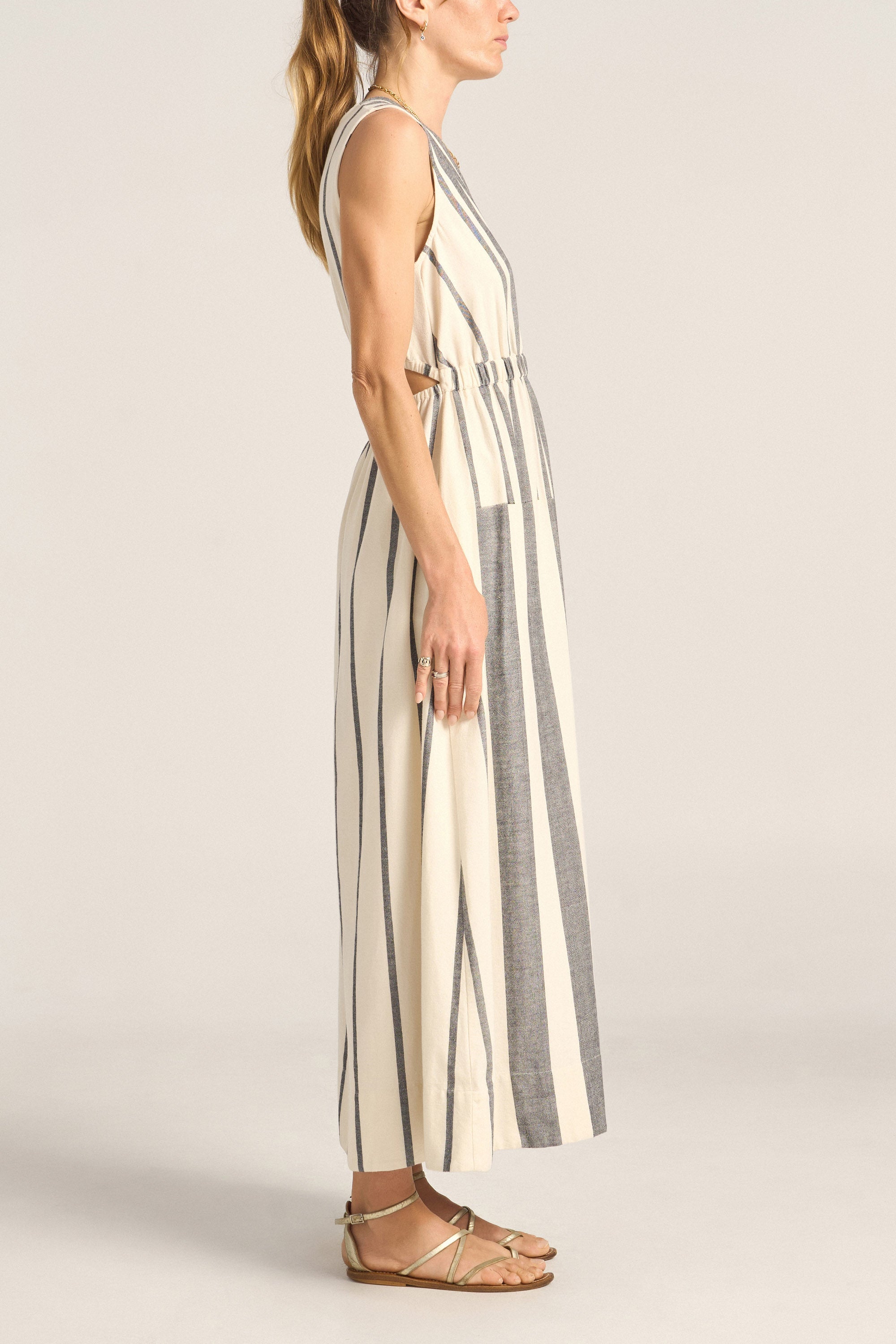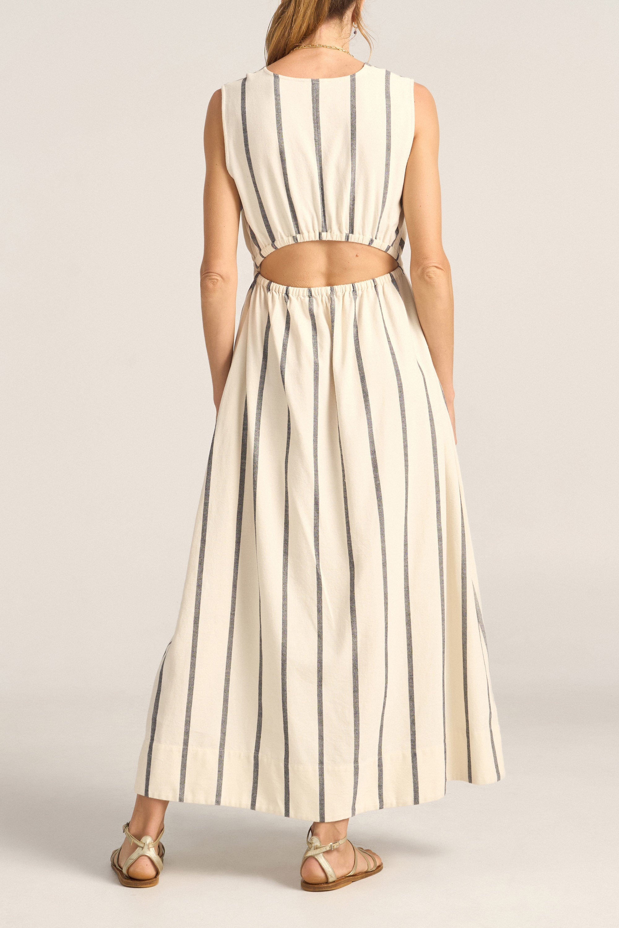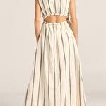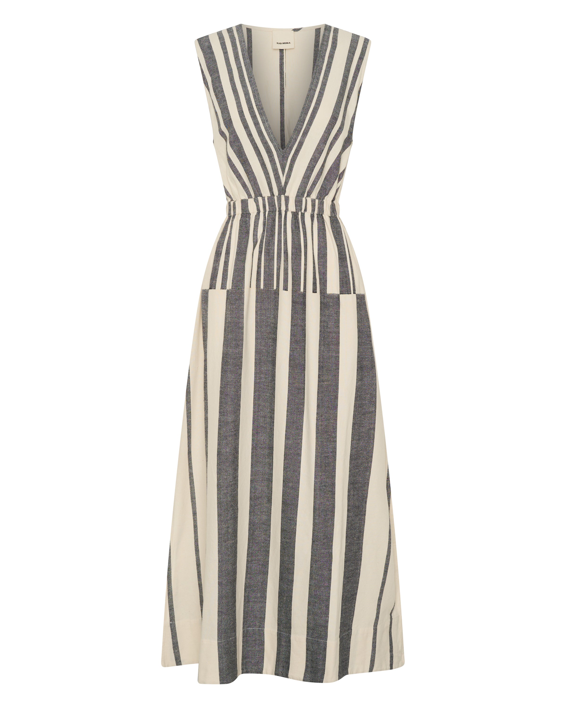 The Eirene Dress is a classic silhouette with a feminine edge. Crafted in our signature black and white broken stripe, it is a true labour of love—meticulously woven one thread at a time, by our artisans in India on traditional handlooms, each piece takes days to complete. This sleeveless style features a flattering V-neckline, an elasticated waistband that softly cinches the body, and a peek-a-boo detail at the back waist for a touch of skin. Long length, the flowy skirt features side pockets and side slits to allow for ease and movement, making this dress a perfect piece for warm, sun-filled days. A celebration of craftsmanship and slow fashion for modern life.