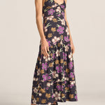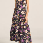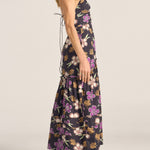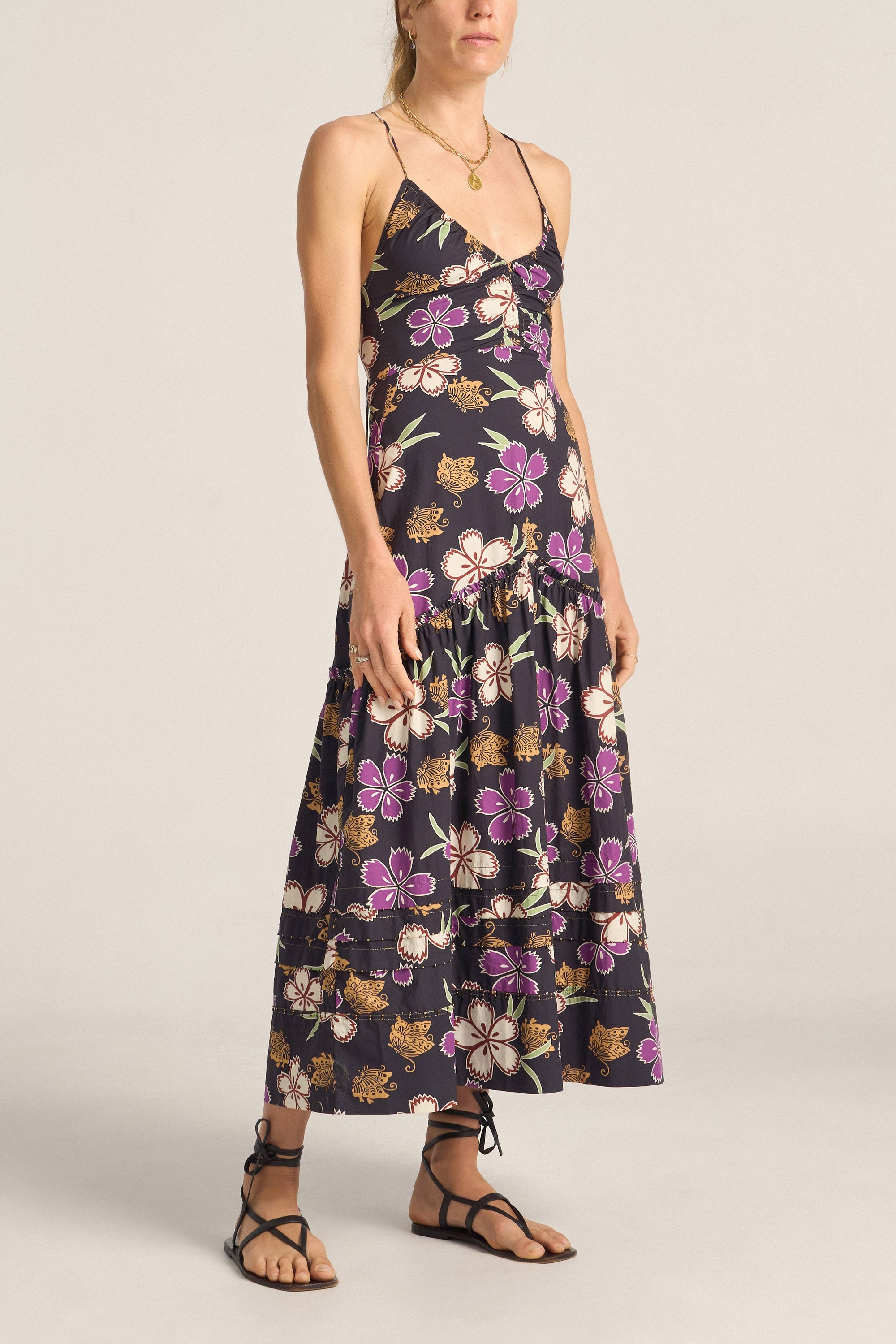 The Eucleia Dress is a midi-length, graceful silhouette crafted from a vibrant hibiscus printed cotton poplin, where deep purples and soft creams mingle in delicate floral patterns. Featuring thin straps with an open back and a flattering V-neckline, the bodice is finely ruched for a hugging fit. The skirt has a fitted hip yoke, with a richly gathered tier adorned with pleats and delicate gold beading that encircles the sweep, adding an artisanal shimmer that catches the light with every movement. A discreet back zip ensures ease of wear, making the Eucleia Dress effortlessly elegant and a refined choice for sunlit days and balmy evenings.