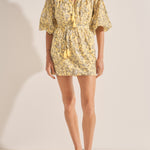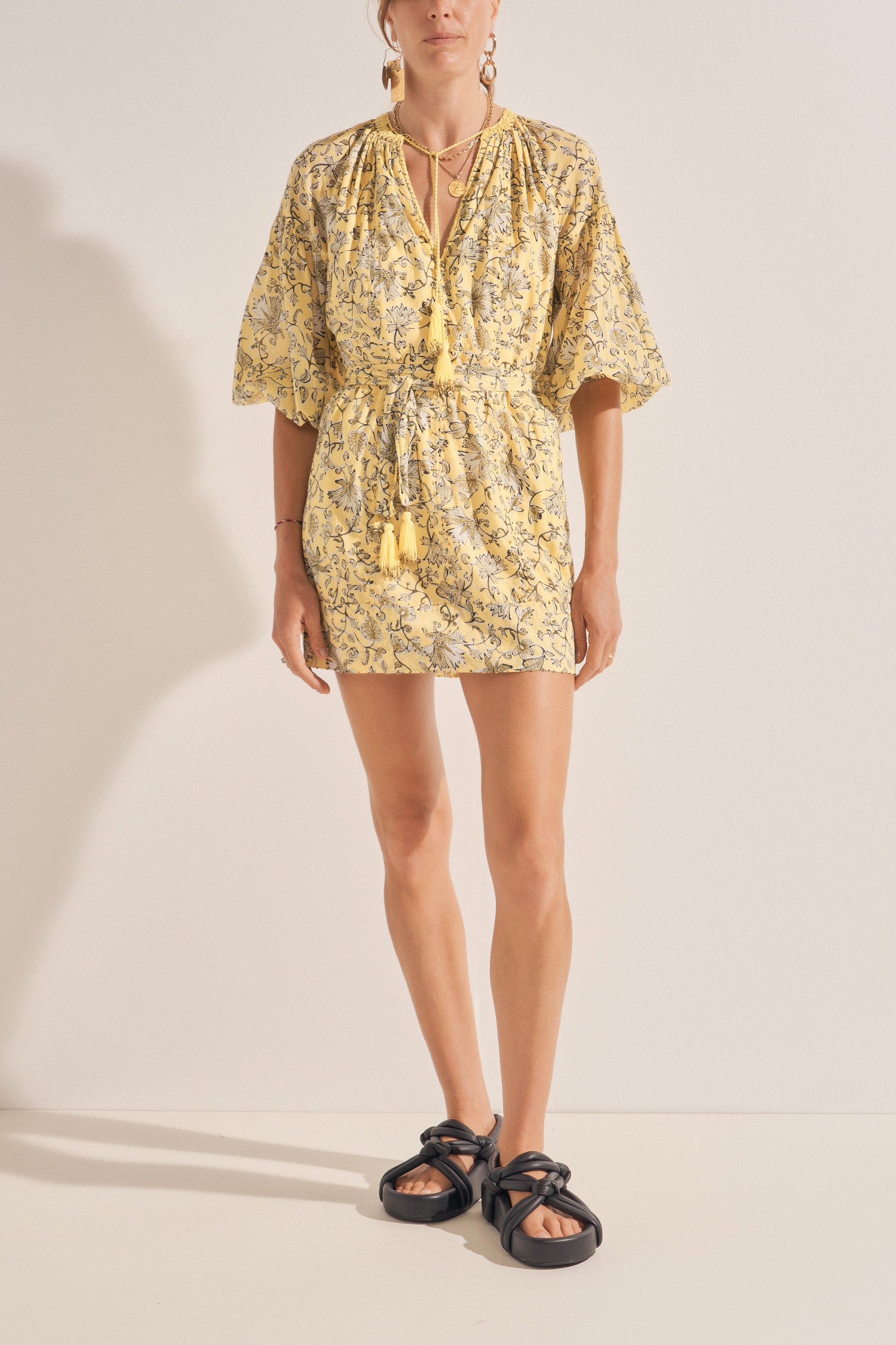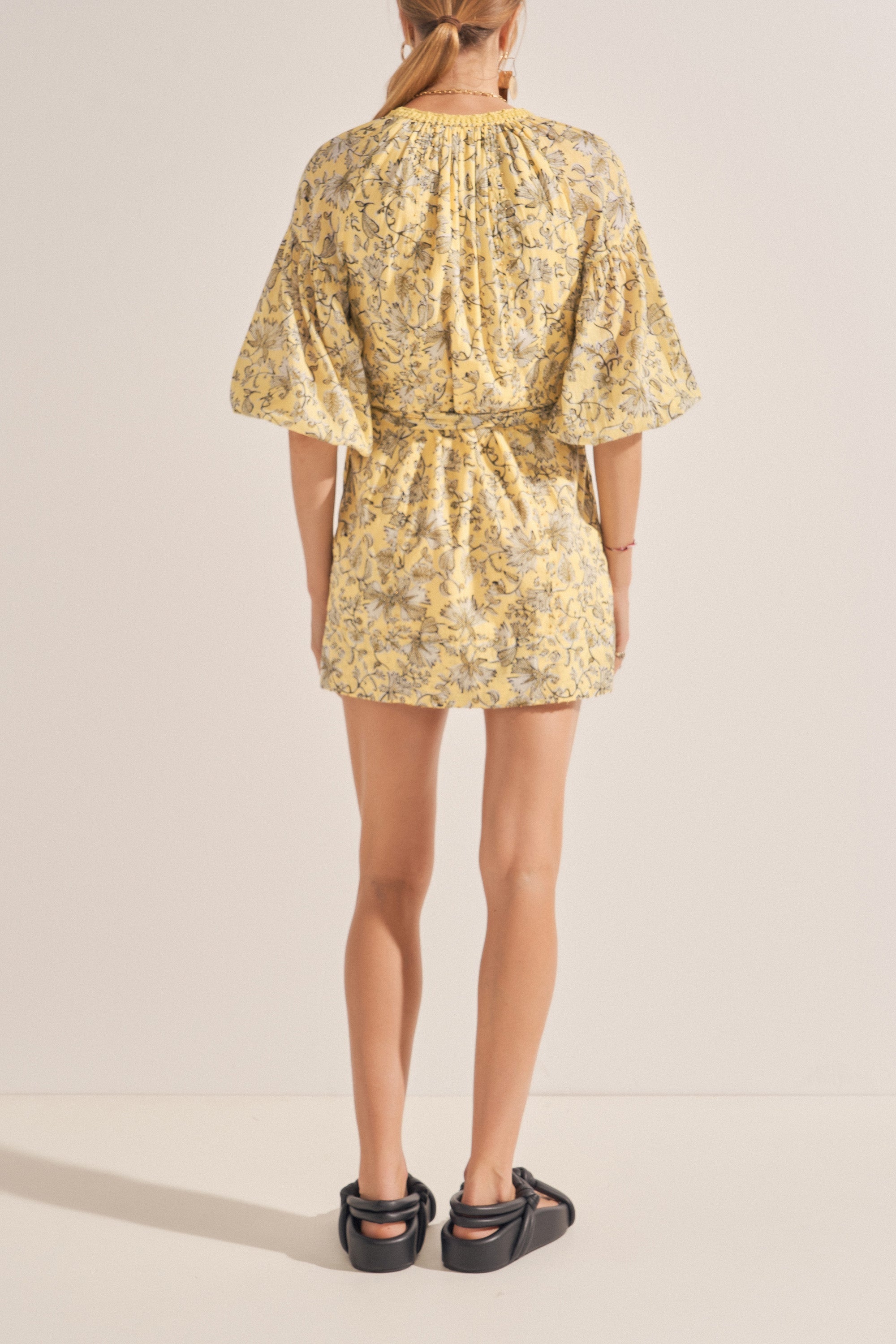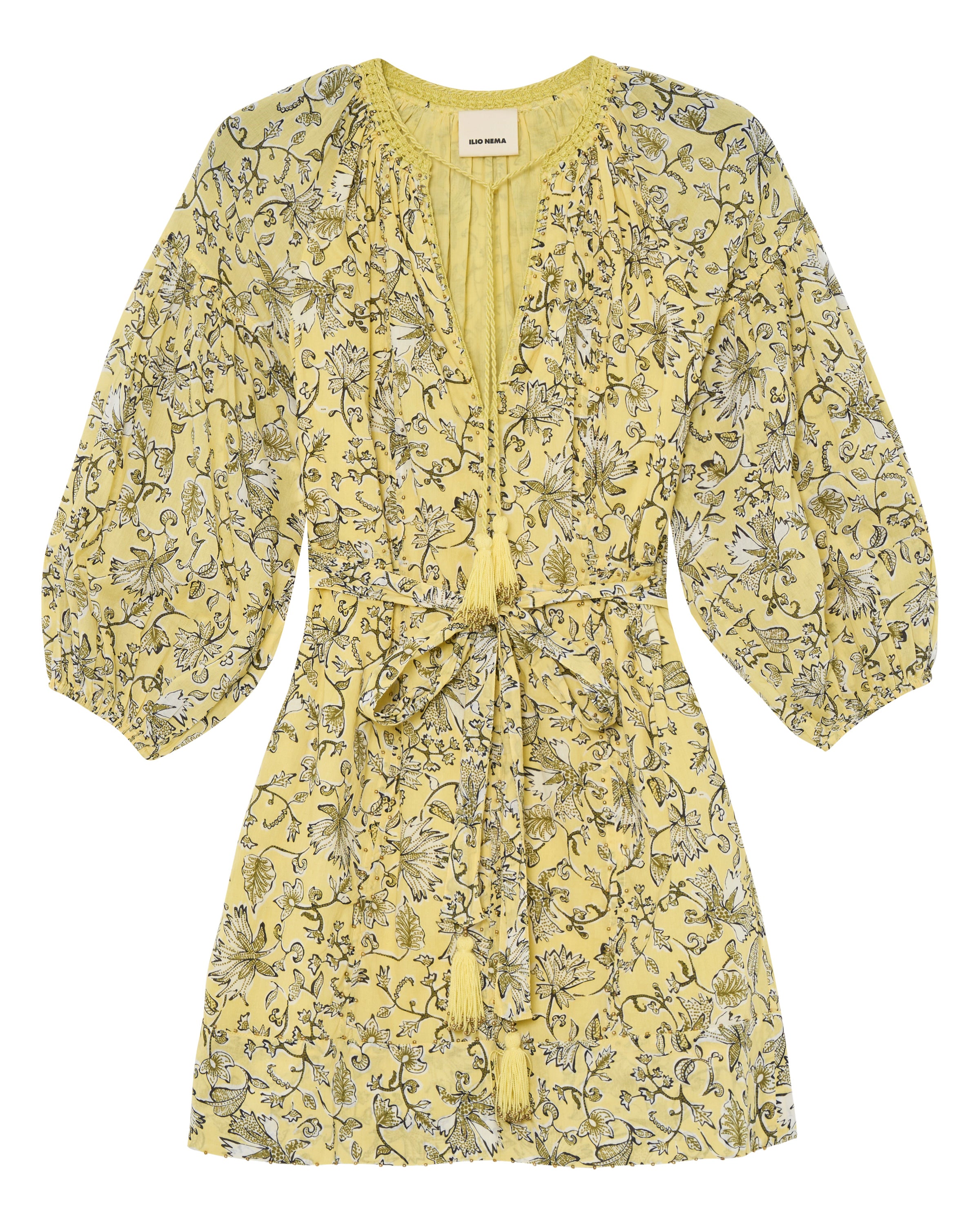 The Peithos Dress is mini-length with 3/4 length voluminous sleeves. Made from the softest organic cotton voile and printed with an Ilio Nema original batik-inspired print. It features delicate hand-beading details and hand-crochet neckband. This close-to-the-body shape can be dressed up or down increasing its versatility. The dress is lined with organic cotton voile and comes with a removable cotton waist tie featuring hand-made tassels.