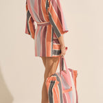 The Ariane Robe in Fira Stripe is a signature ILIO NEMA piece crafted from handloom blues and pink stripes with gold accents. Effortlessly chic, it works perfectly as a beach cover-up, poolside outfit, or even layered over jeans as a light jacket. Featuring a deep neckline, patch pockets, and a separate self-tie belt, it’s a versatile and stylish addition to your wardrobe.