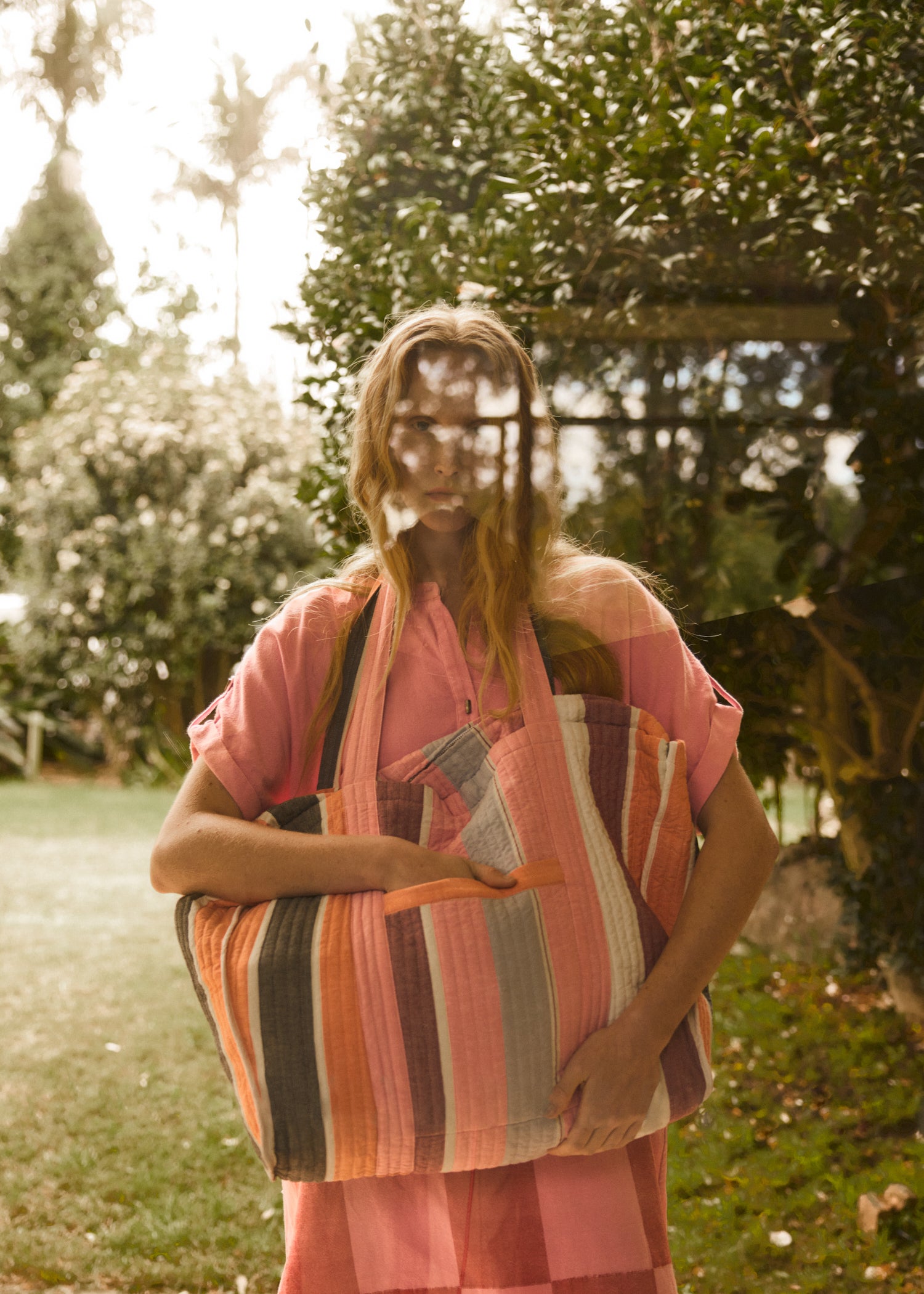 The Hydra Tote is crafted from the new vibrant Fira Stripe , featuring quilted stitching and a lightly padded design. With a top zip closure, an outside patch pocket for easy access, and an inside zipped pocket for valuables, it combines style and functionality. Colourful and playful, this oversized tote is the perfect beach bag or weekender travel companion.