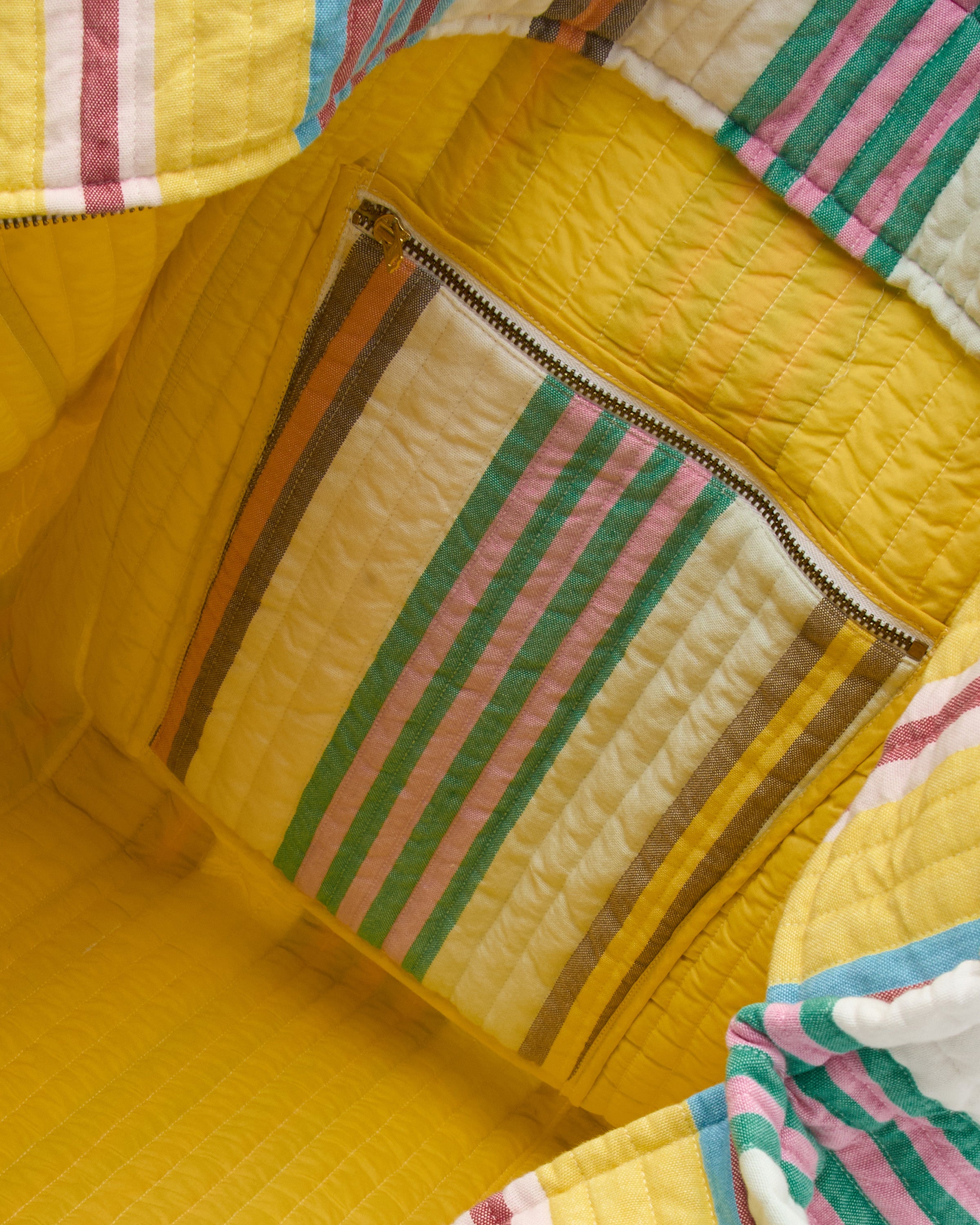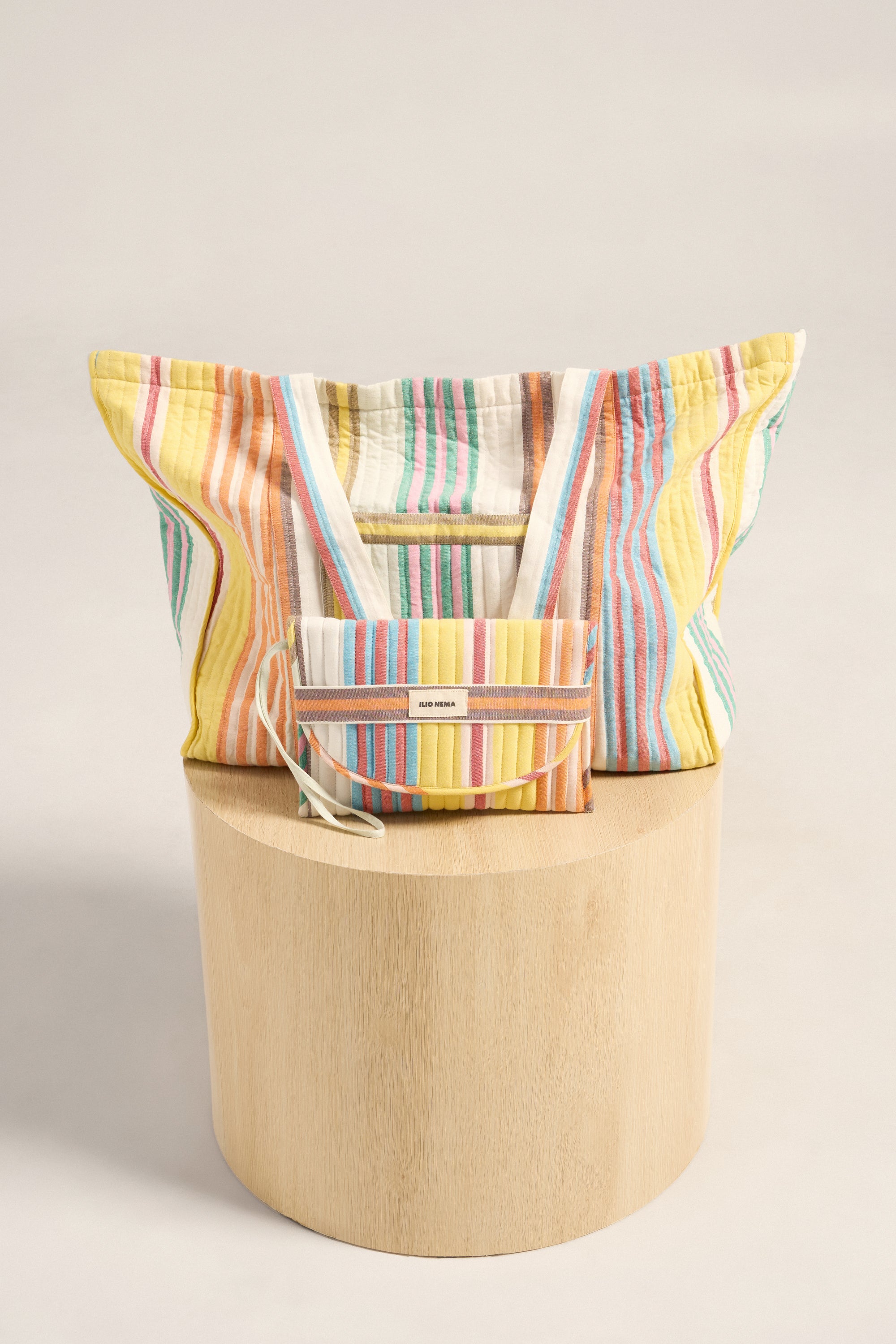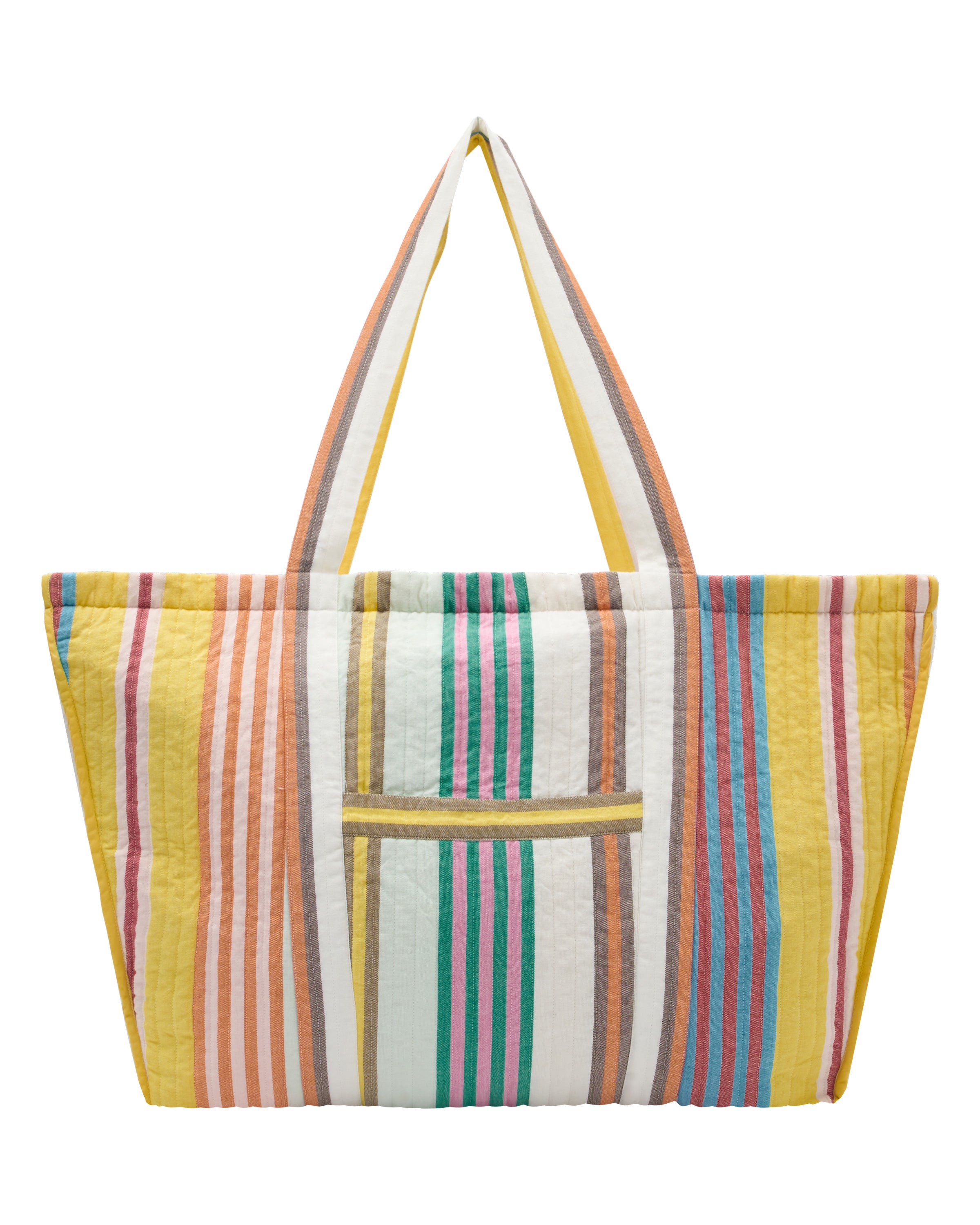 The Hydra Tote and matching pouch is crafted from the new Heraklion Stripe fabric, featuring quilted stitching and a lightly padded design. The Hydra Tote features a top zip closure, an outside patch pocket for easy access, and an inside zipped pocket for valuables, it combines style and functionality. Colourful and playful, this oversized tote is the perfect beach bag or weekender travel companion and comes with a matching pouch.
