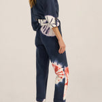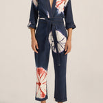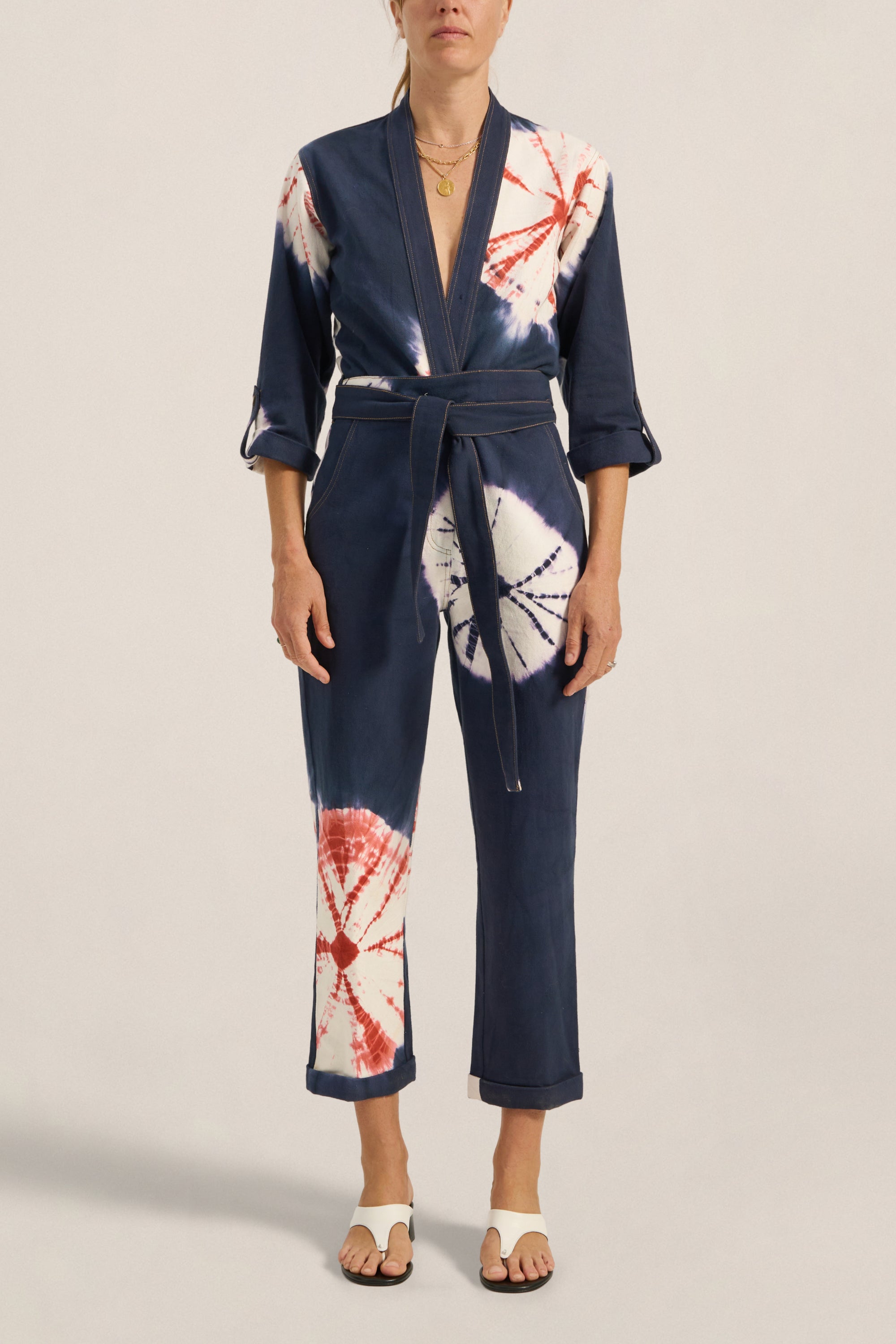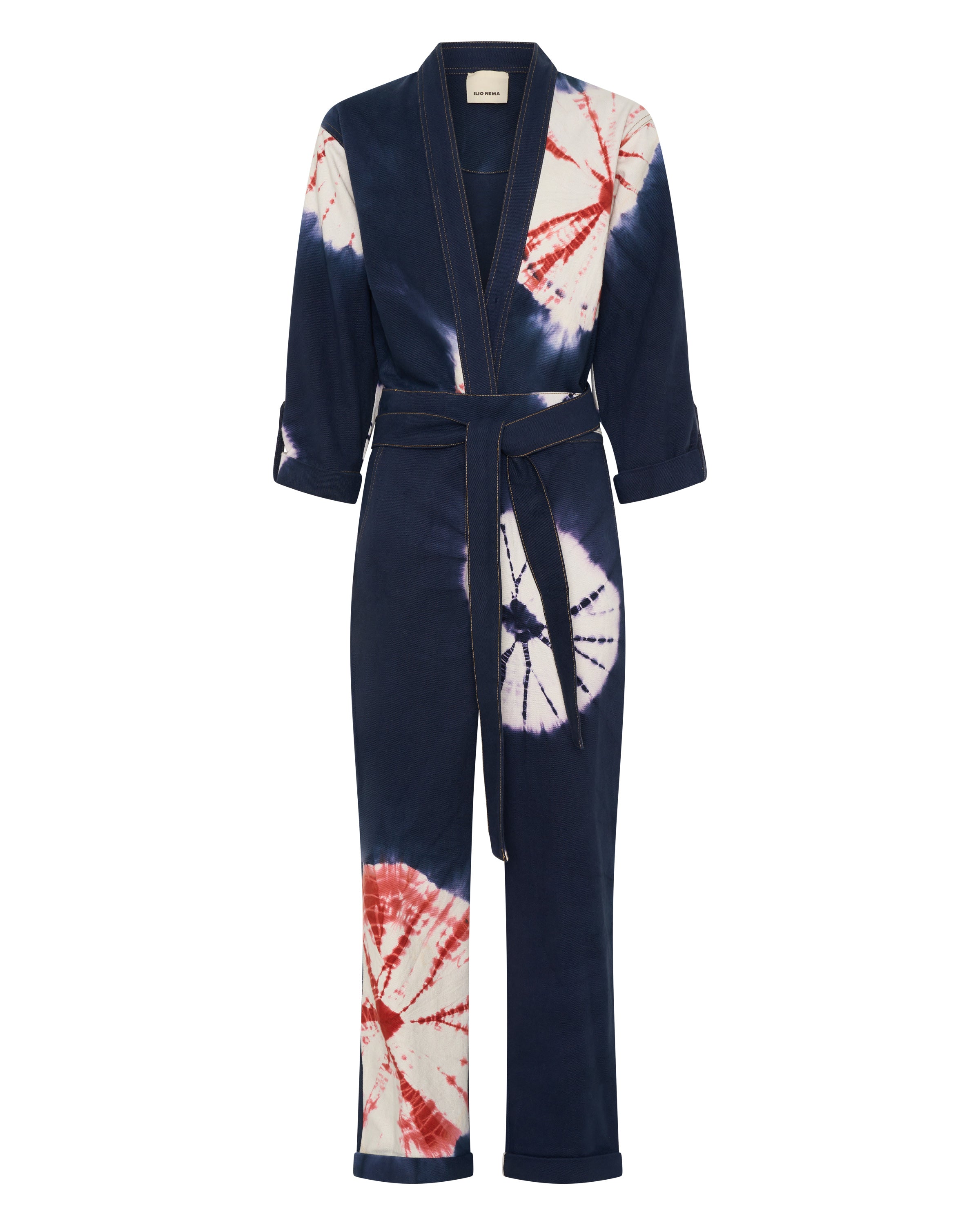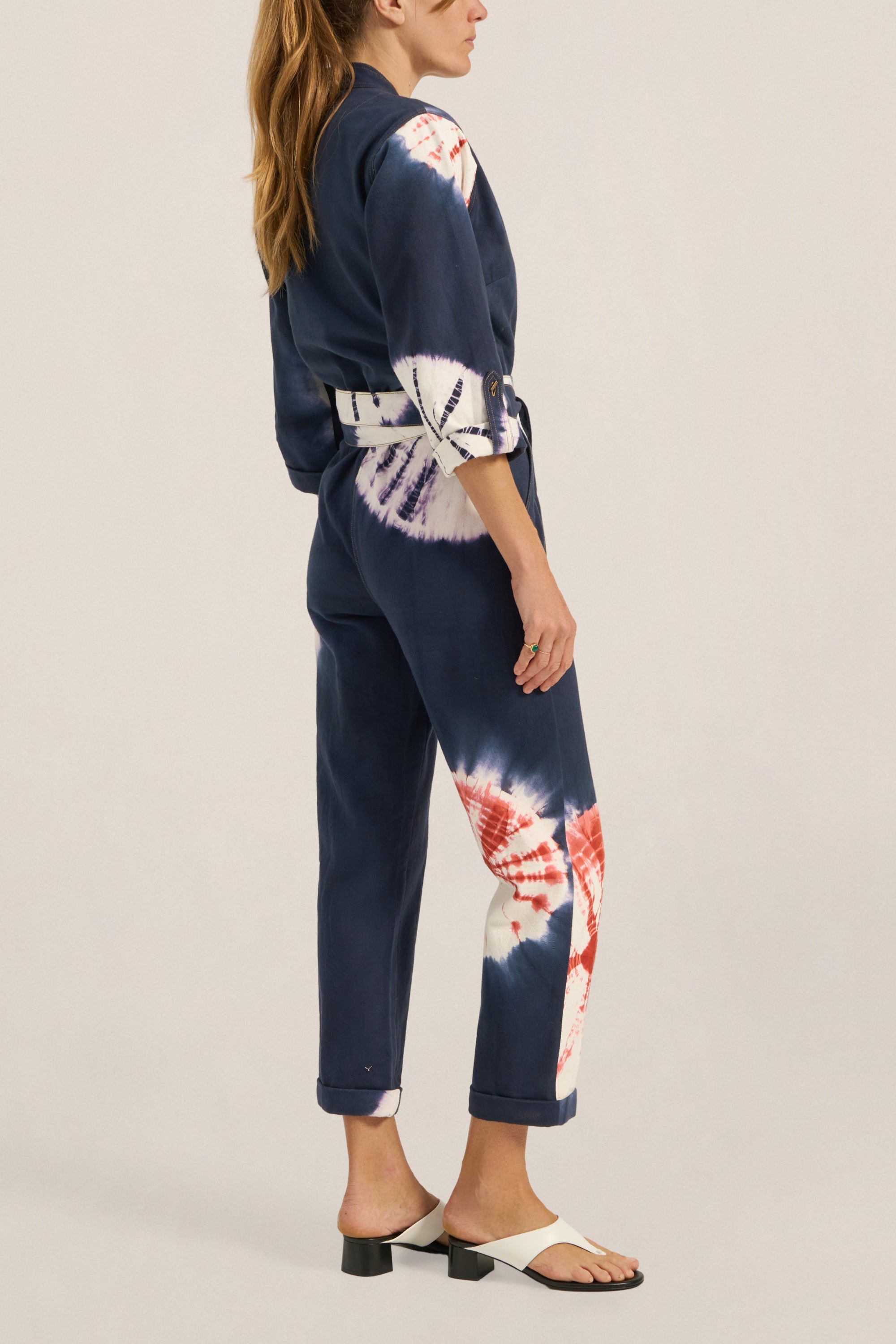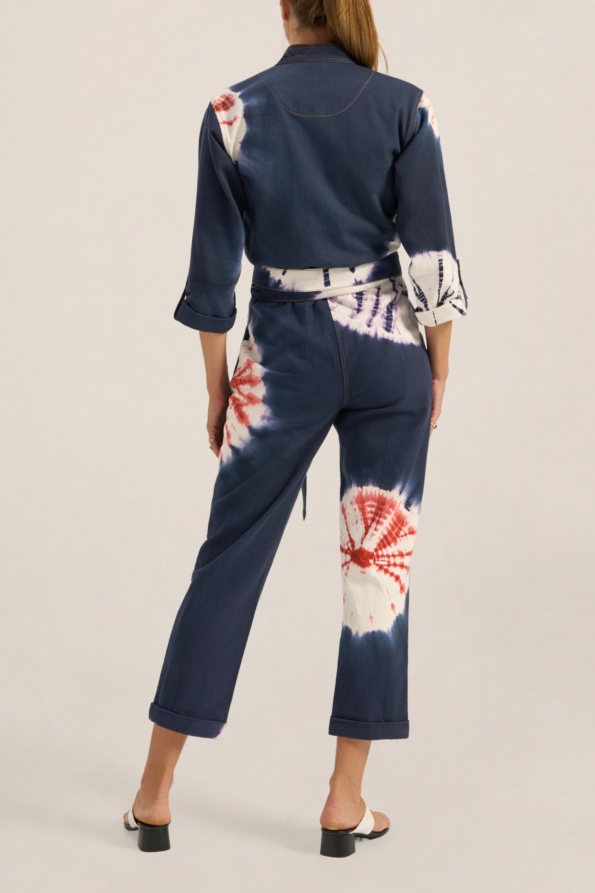 The Pan Hand Tie-Dye Denim Boilersuit is a relaxed, tapered silhouette crafted from 100% cotton denim, hand tie-dyed using a shibori-inspired technique. Each garment is individually folded, bound and tied by hand before being submerged in resist dye. A multi-step craft repeated, where no two pieces emerge the same. The result is a living pattern of real indigo, terracotta and white, entirely unrepeatable. This piece features a double wrap waist tie, plunging v-neck, 3/4 rolled sleeves and rolled cuffs. The Pan Boilersuit is perfect for relaxed gatherings or dressed up effortlessly as the light fades into the evening.