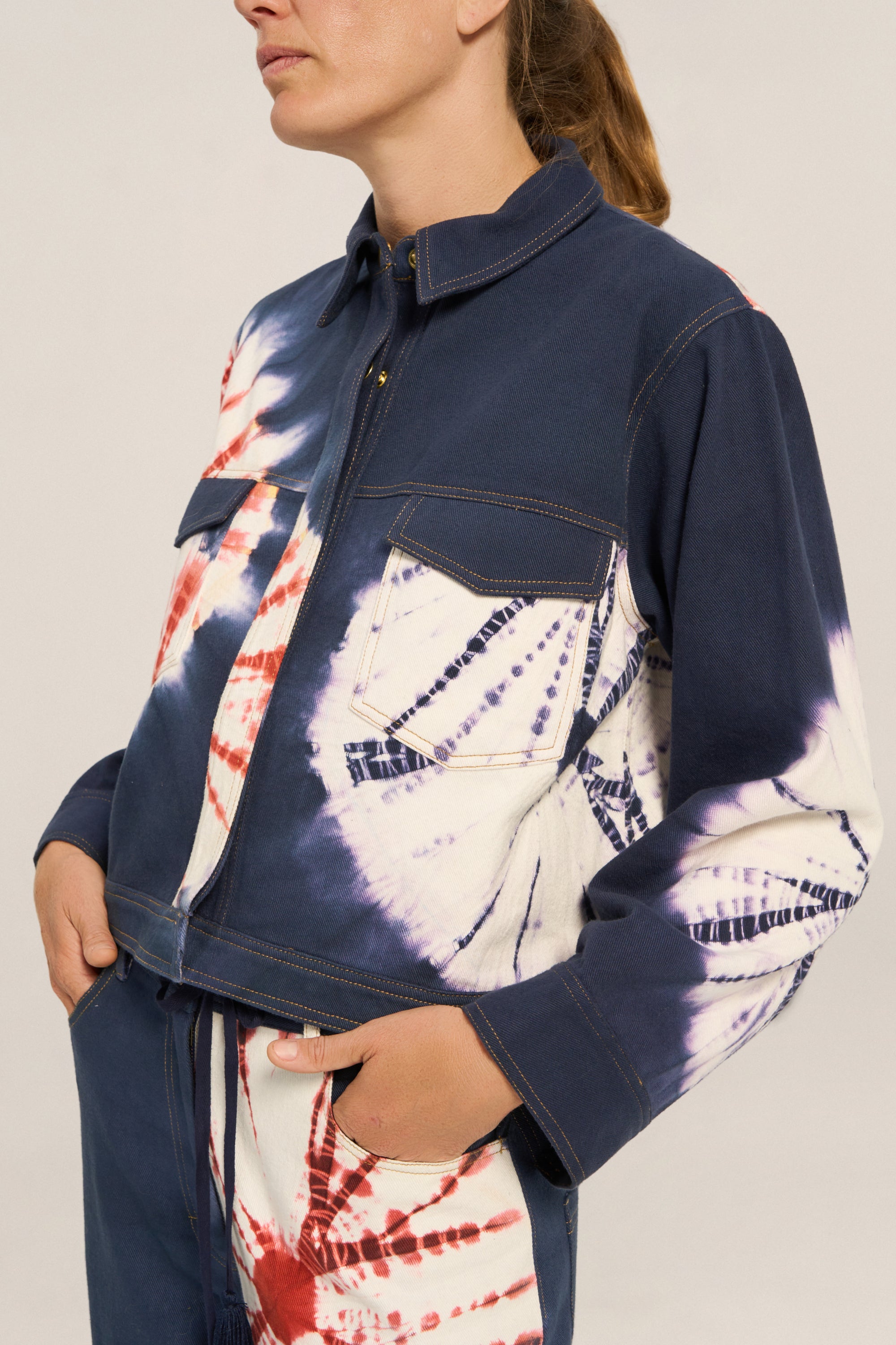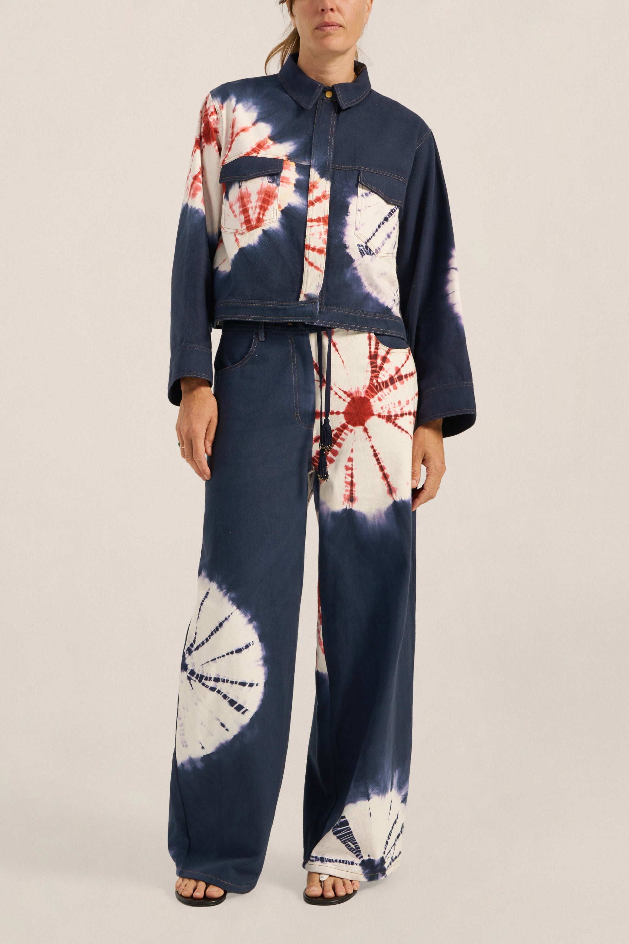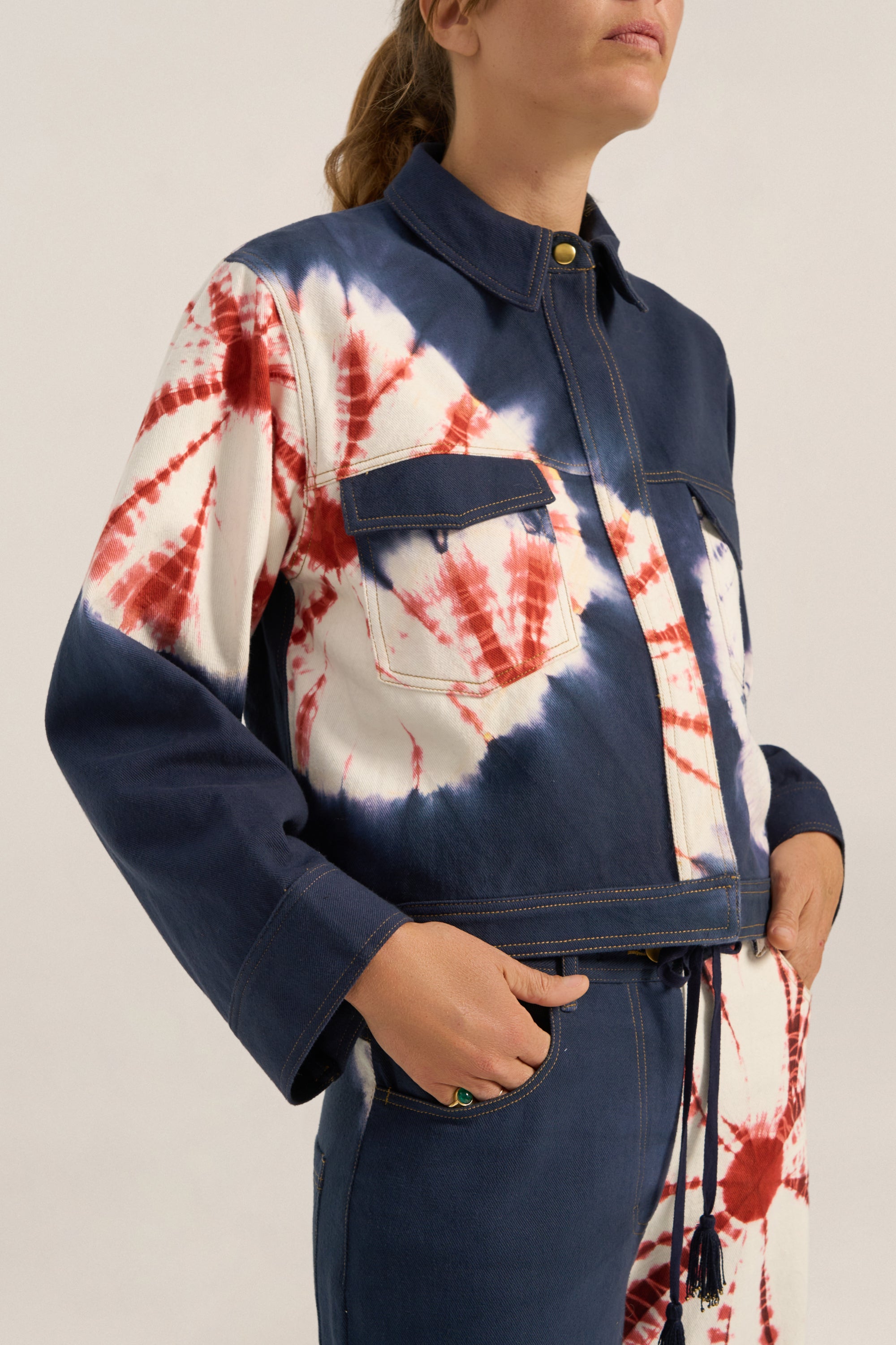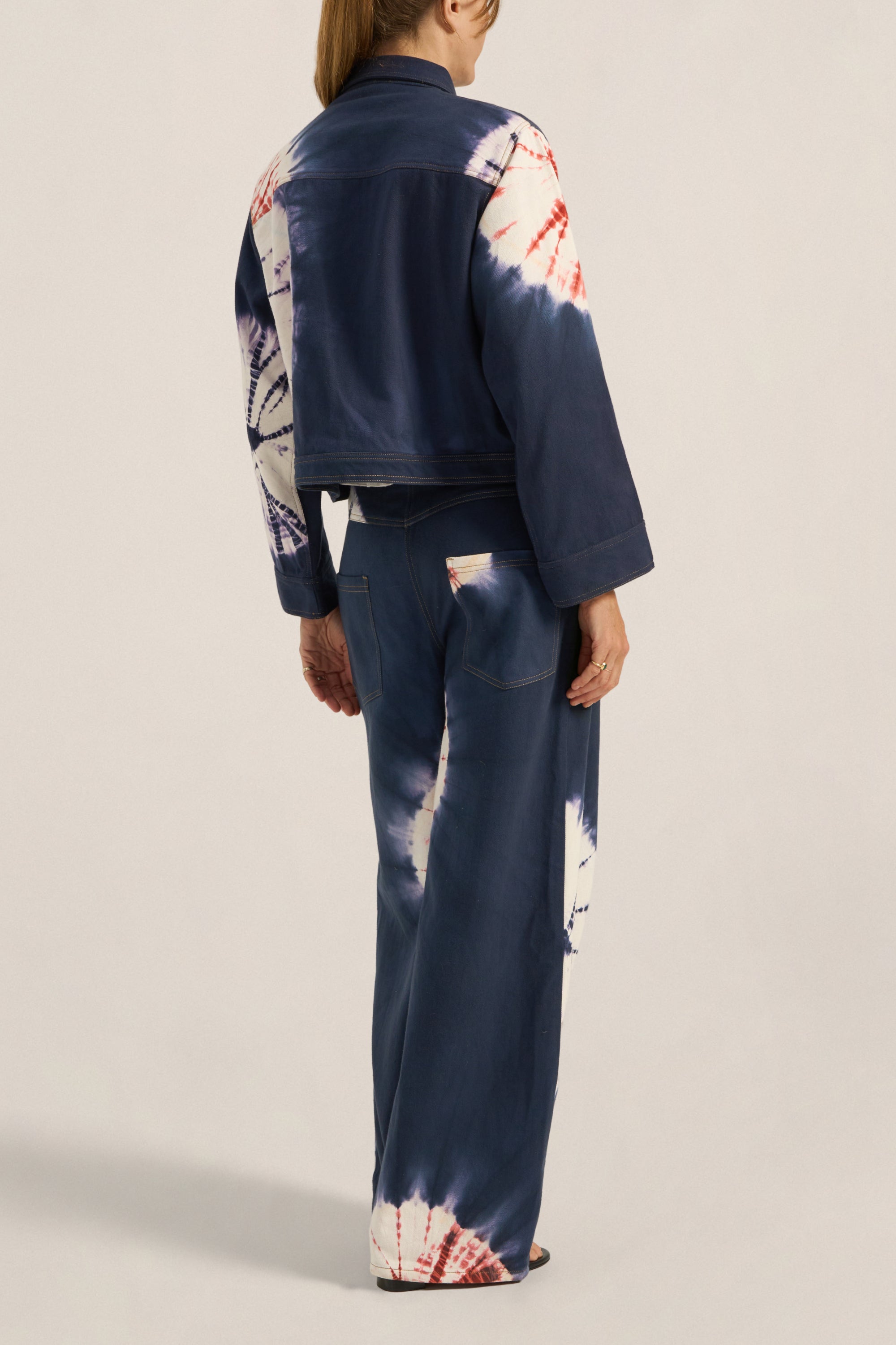 The Virgil Hand Tie-Dye Denim Jacket is a cropped, relaxed silhouette crafted from 100% cotton denim, hand tie-dyed using a shibori-inspired technique. Each garment is individually folded, bound and tied by hand before being submerged in resist dye. A multi-step craft repeated, where no two pieces emerge the same. The result is a living pattern of real indigo, terracotta and white, entirely unrepeatable. It features a pointed collar, gold snap closure, twin patch pockets, and contrast topstitching throughout. Pair the Virgil Jacket with the Octavia Jean for a coordinated look for those cool evenings.