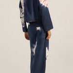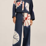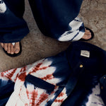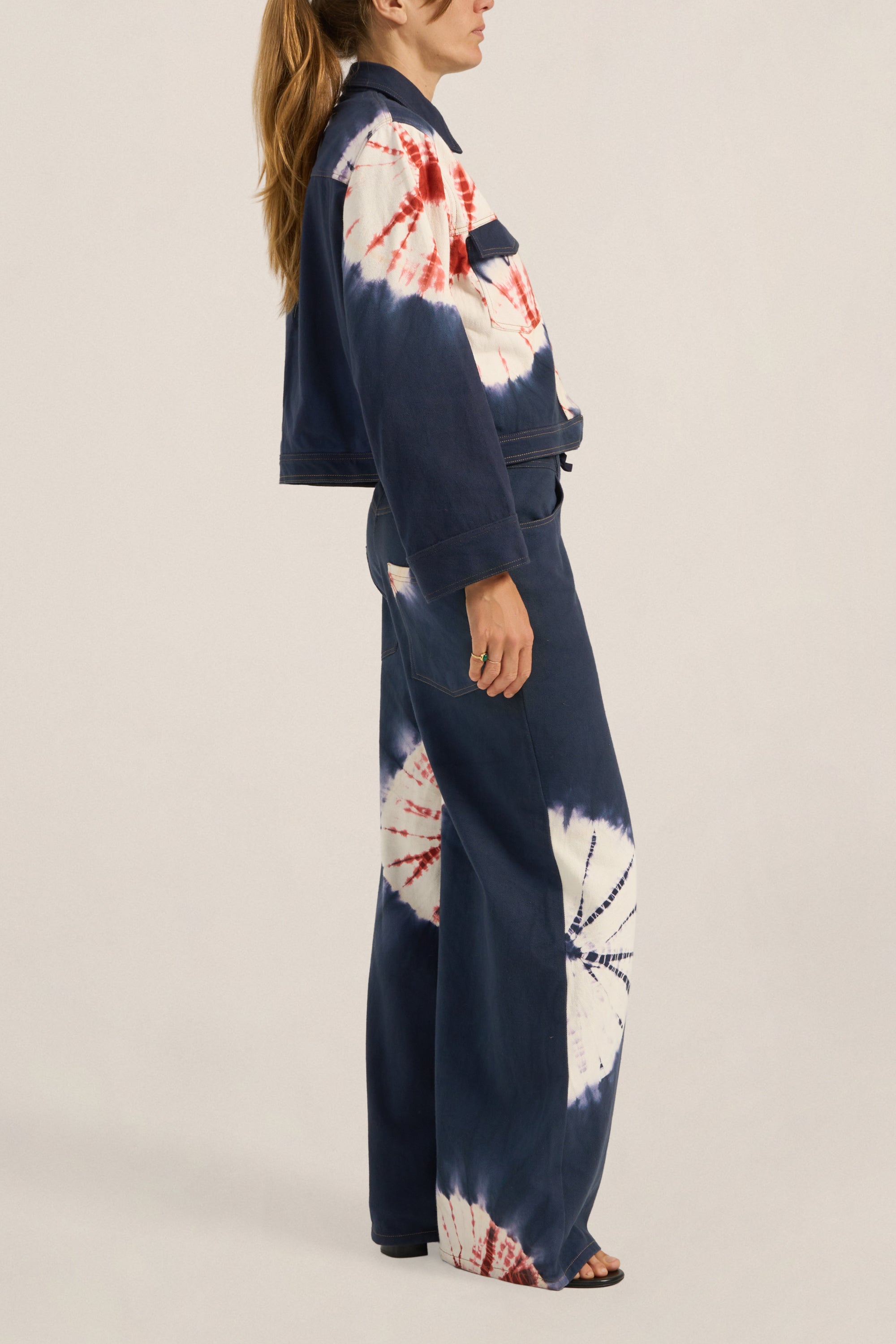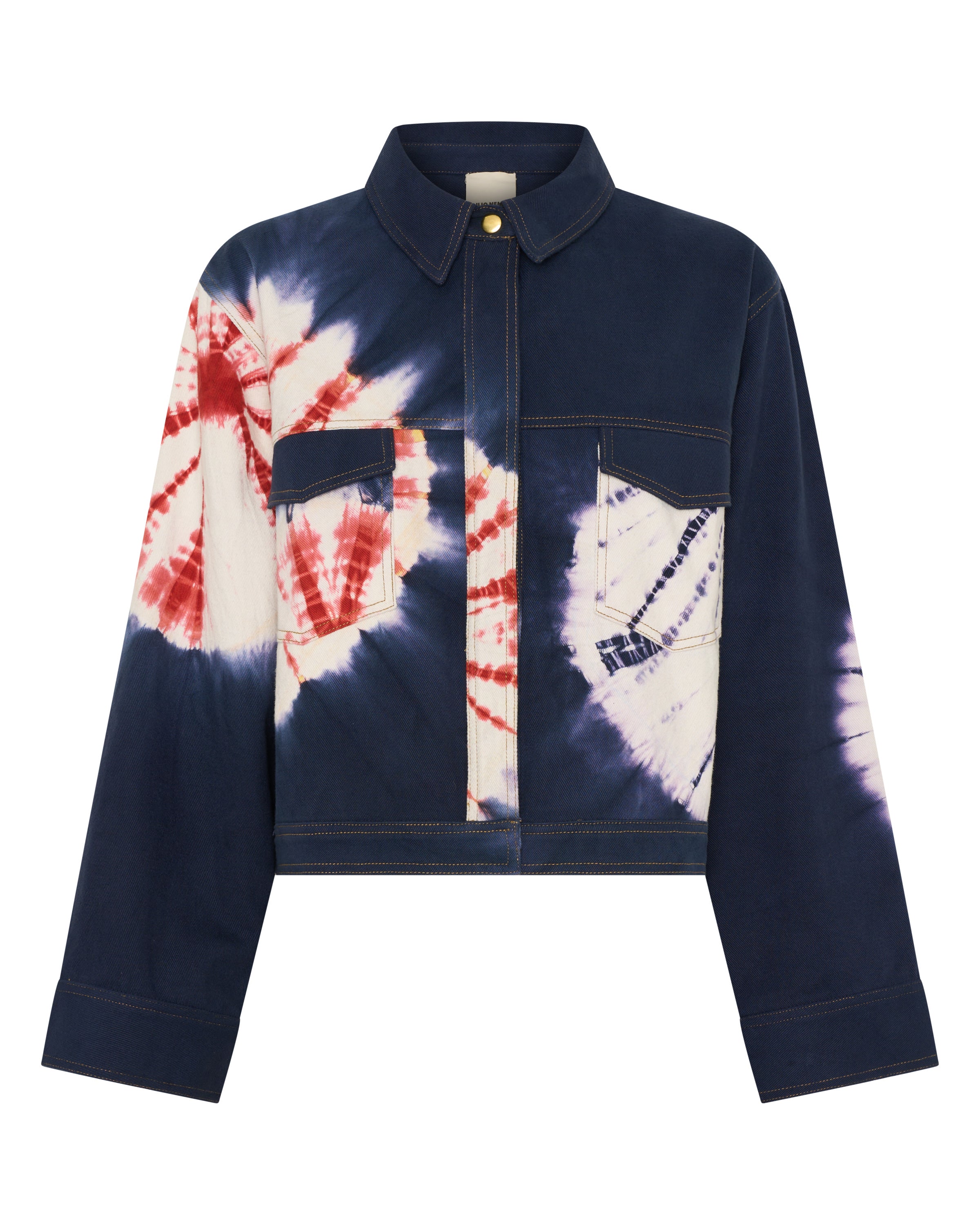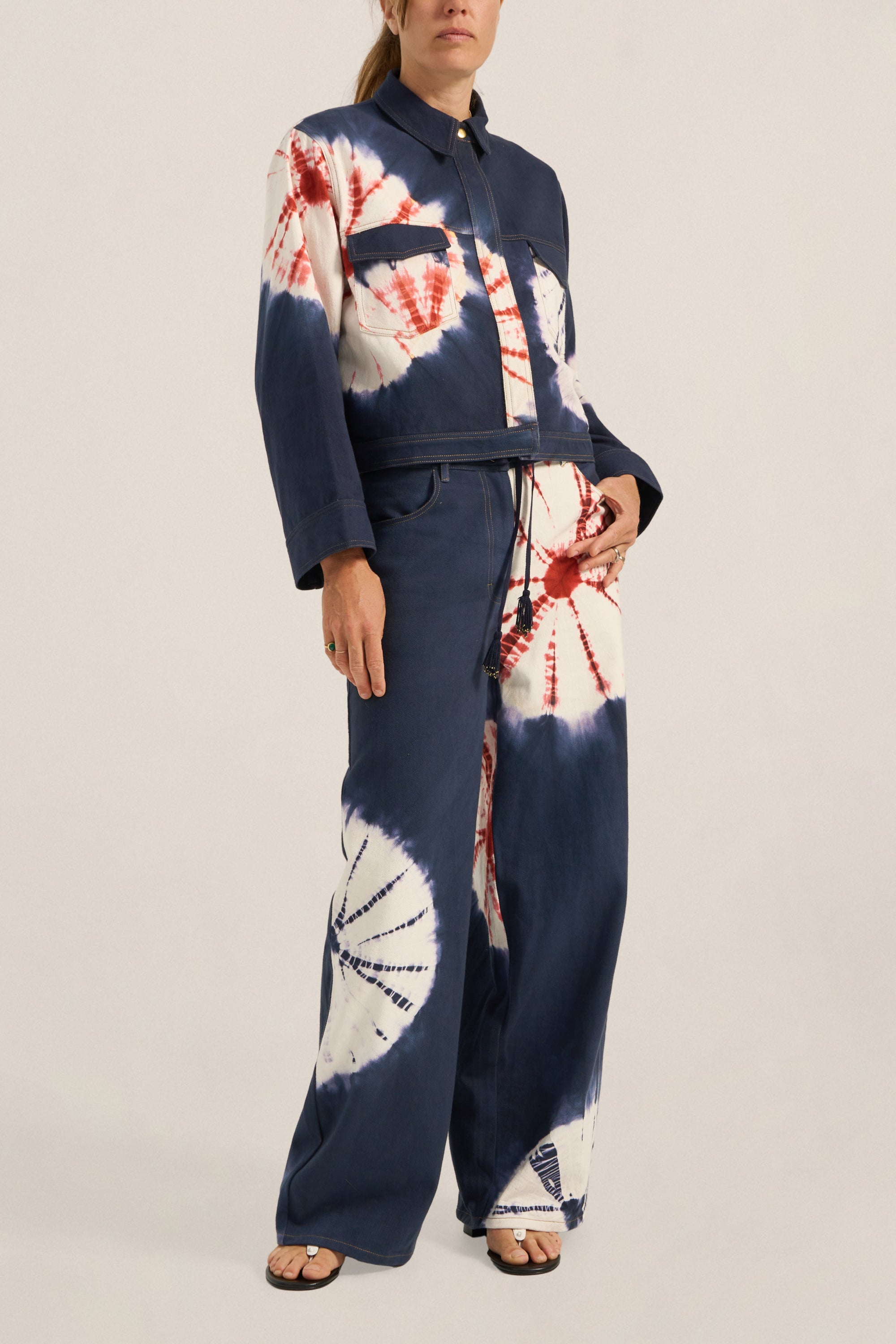 The Virgil Hand Tie-Dye Denim Jacket is a cropped, relaxed silhouette crafted from 100% cotton denim, hand tie-dyed using a shibori-inspired technique. Each garment is individually folded, bound and tied by hand before being submerged in resist dye. A multi-step craft repeated, where no two pieces emerge the same. The result is a living pattern of real indigo, terracotta and white, entirely unrepeatable. It features a pointed collar, gold snap closure, twin patch pockets, and contrast topstitching throughout. Pair the Virgil Jacket with the Octavia Jean for a coordinated look for those cool evenings.