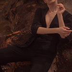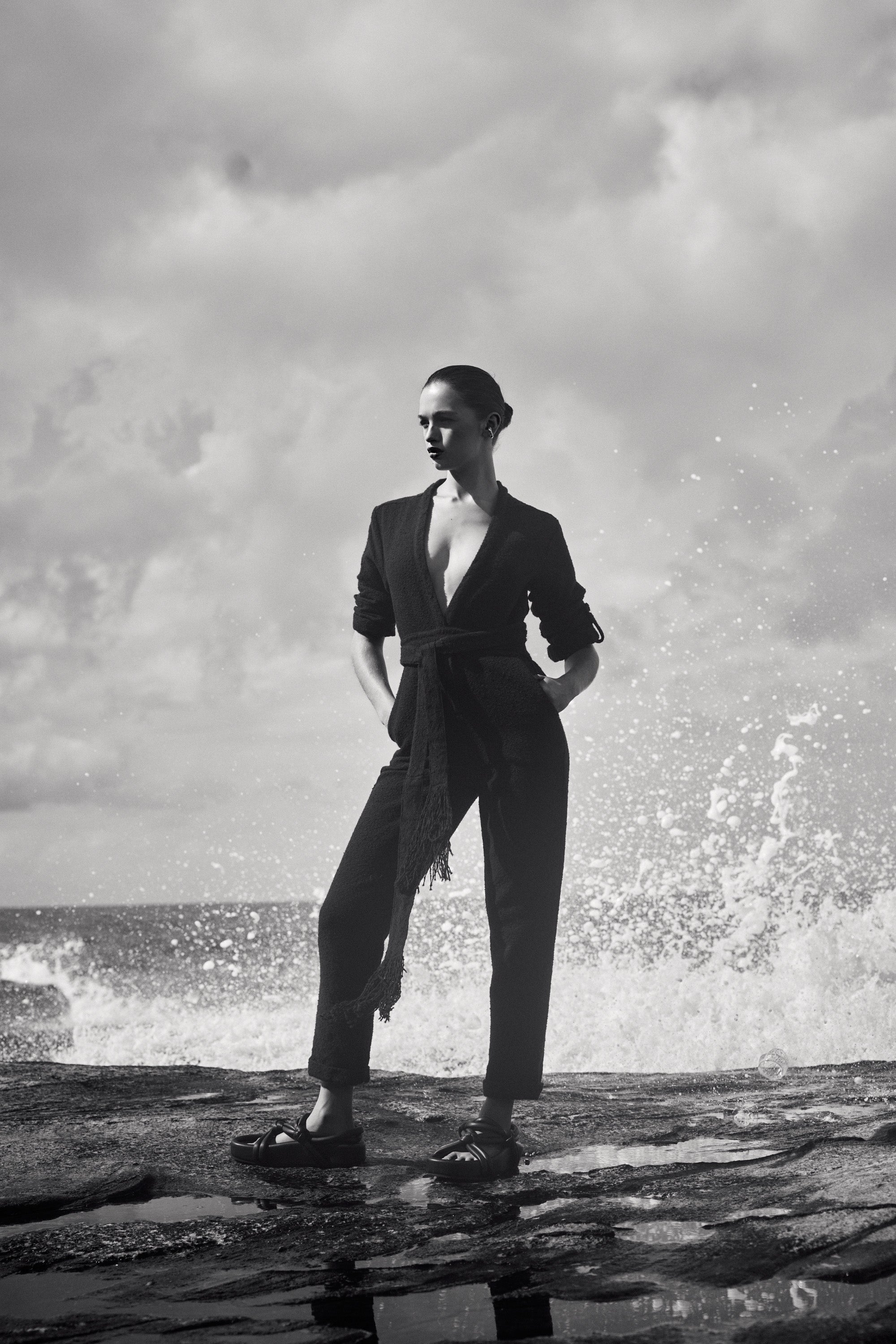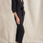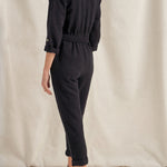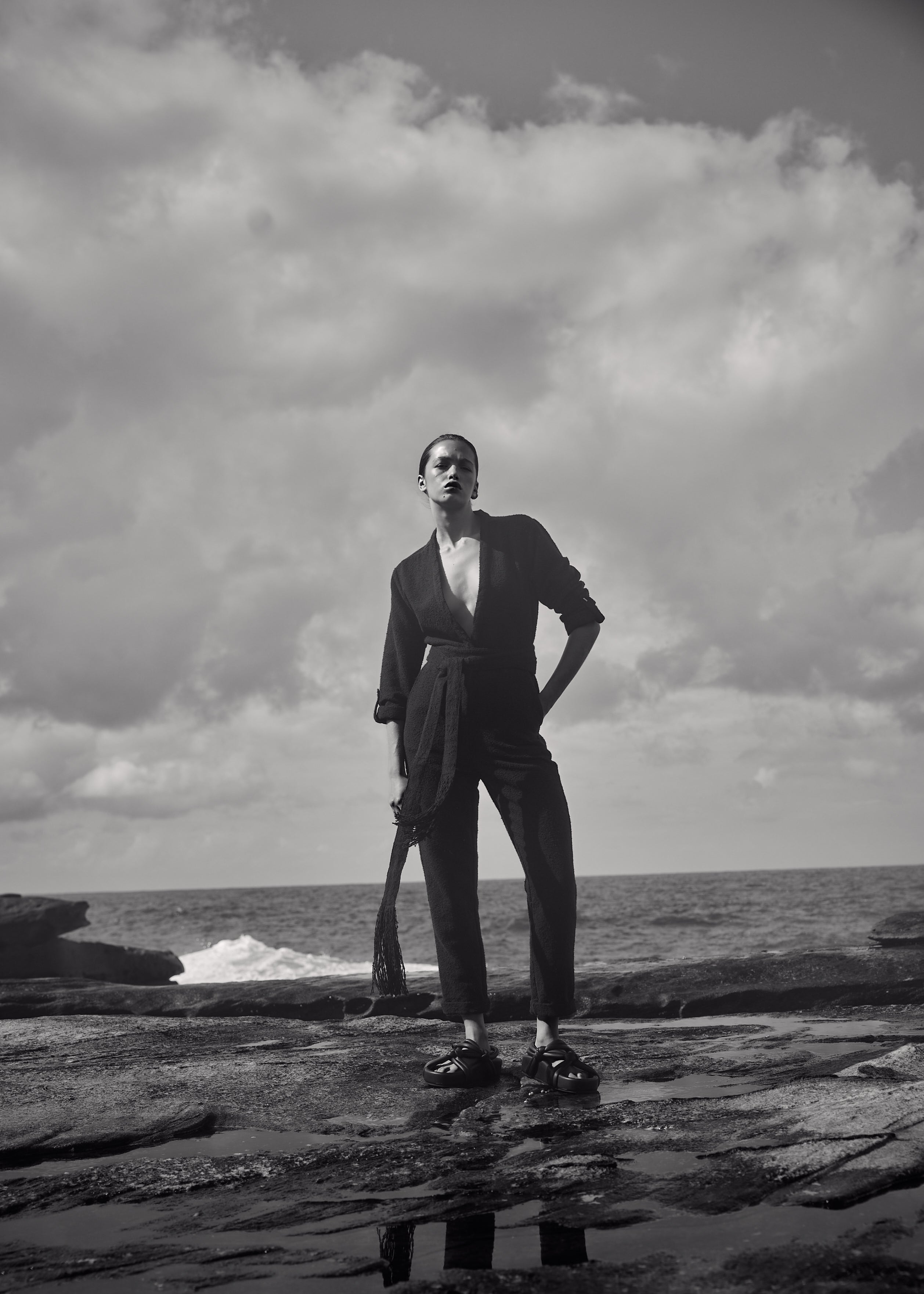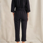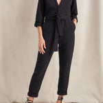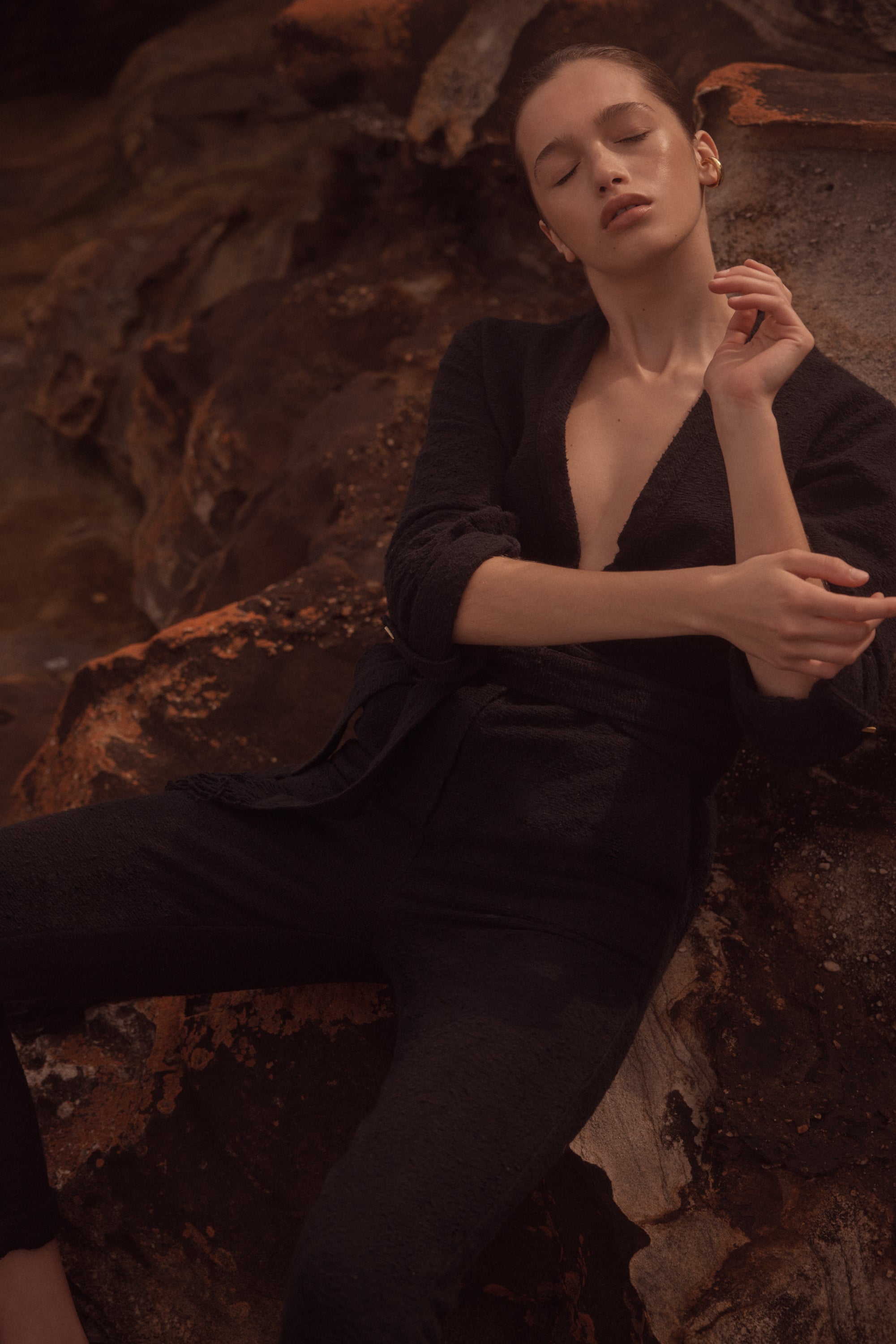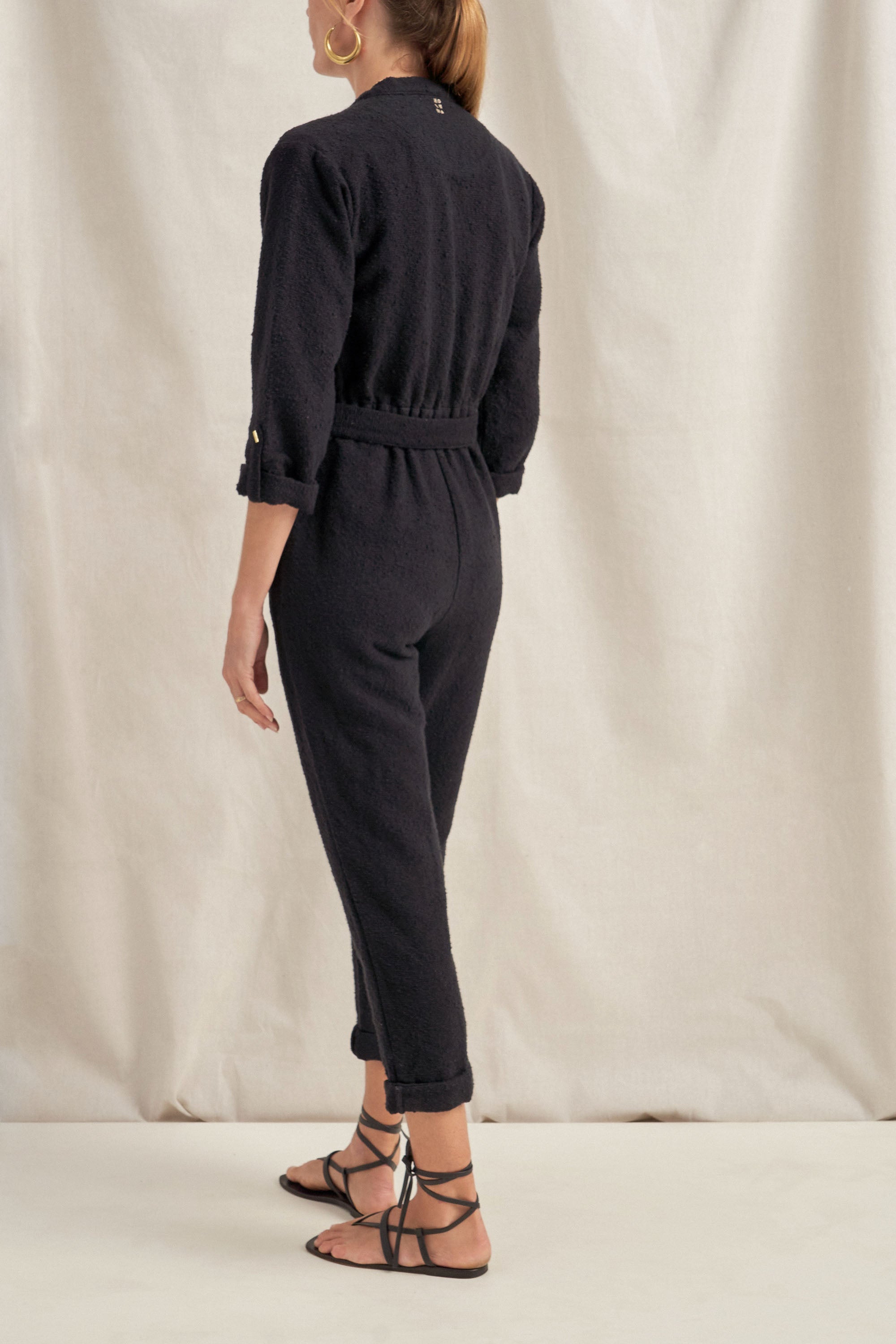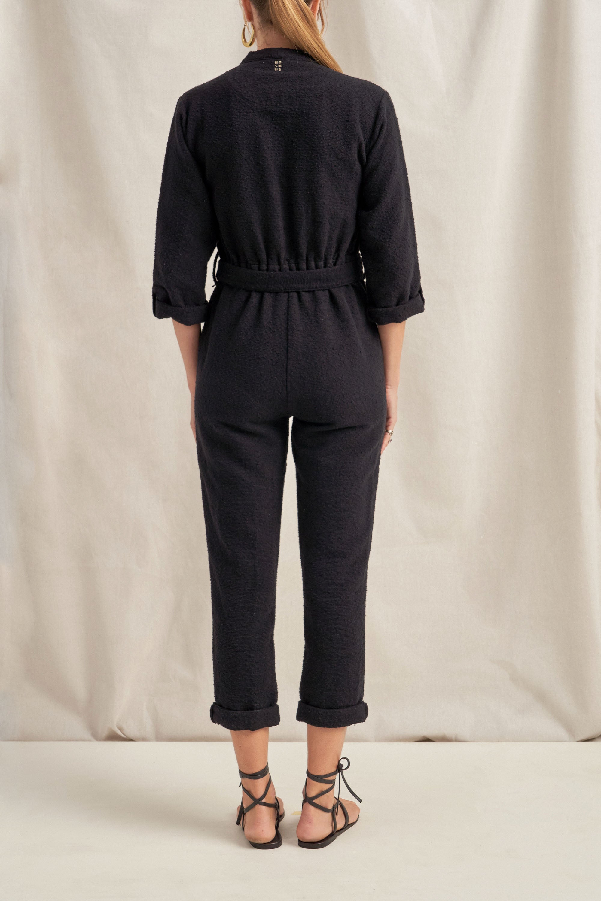 The Pan Jumpsuit is hand-woven in cotton boucle creating a rich, warm and textured fabric. This piece features a double wrap waist tie with fringed ends which were created by unravelling the fabric by hand, plunging v-neck, 3/4 rolled sleeves and rolled cuffs. This luxurious jumpsuit can be dressed up or down.