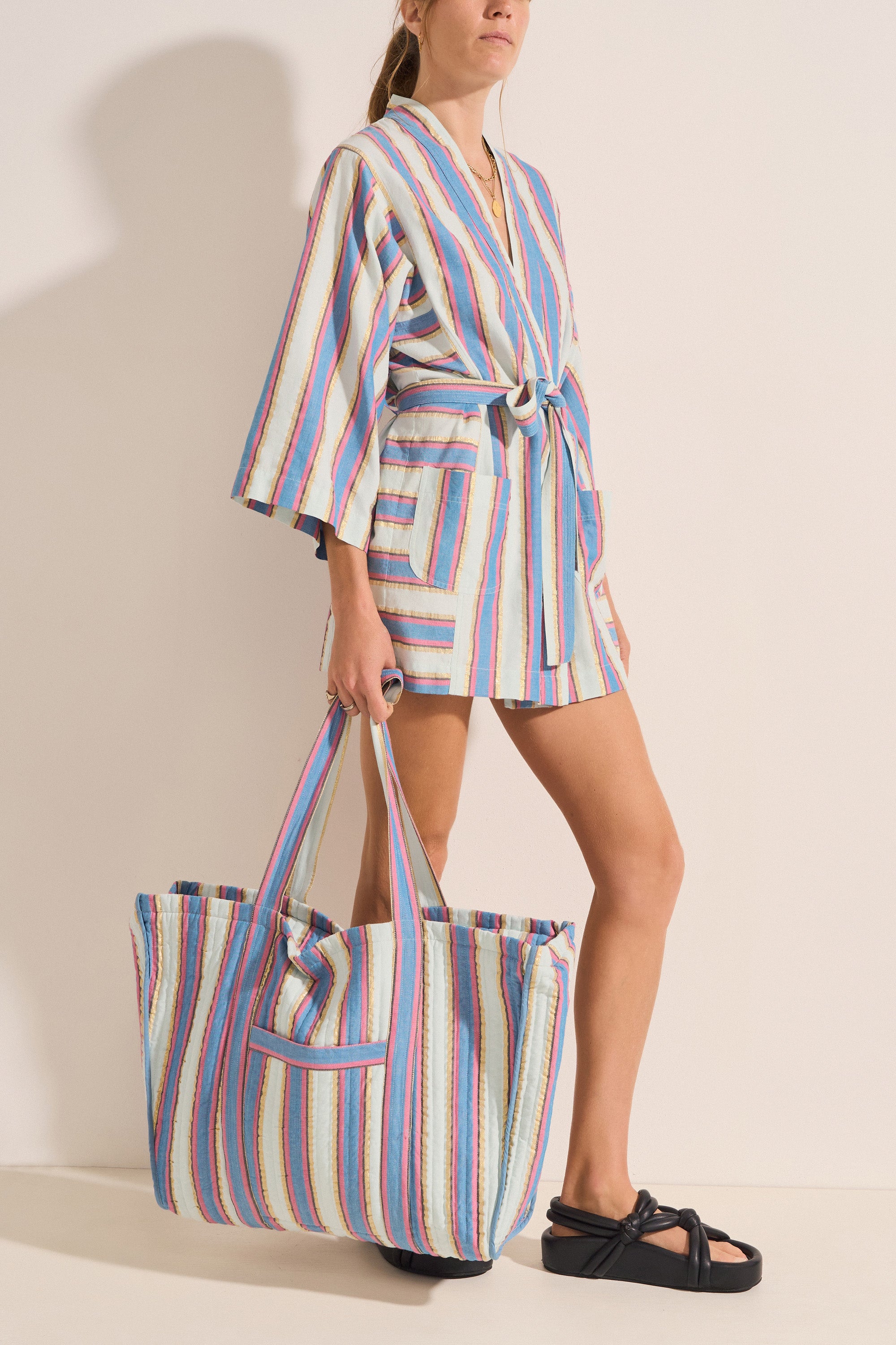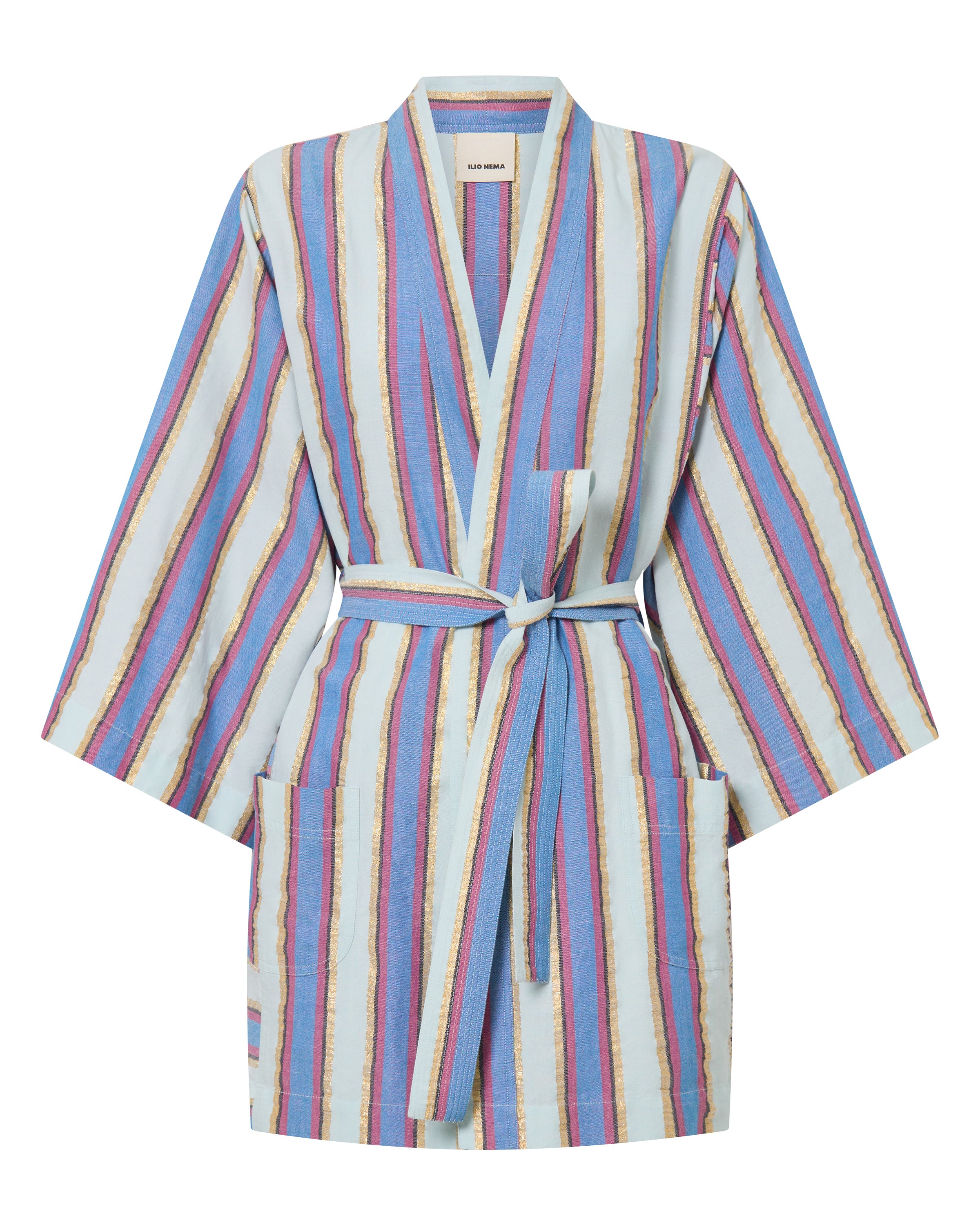 The Ariane Robe in Mykonos Stripe is a signature ILIO NEMA piece crafted from handloom blues and pink stripes with gold accents. Effortlessly chic, it works perfectly as a beach cover-up, poolside outfit, or even layered over jeans as a light jacket. Featuring a deep neckline, patch pockets, and a separate self-tie belt, it’s a versatile and stylish addition to your wardrobe.
