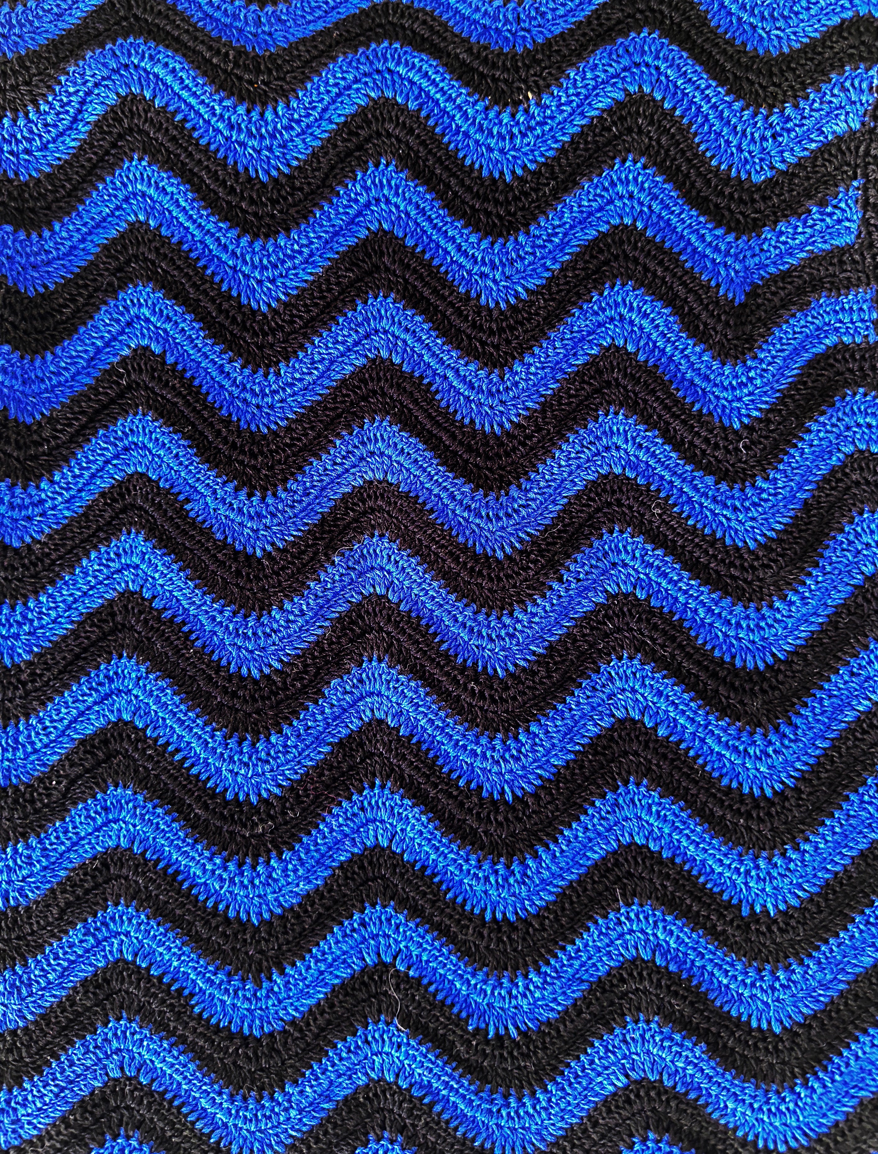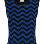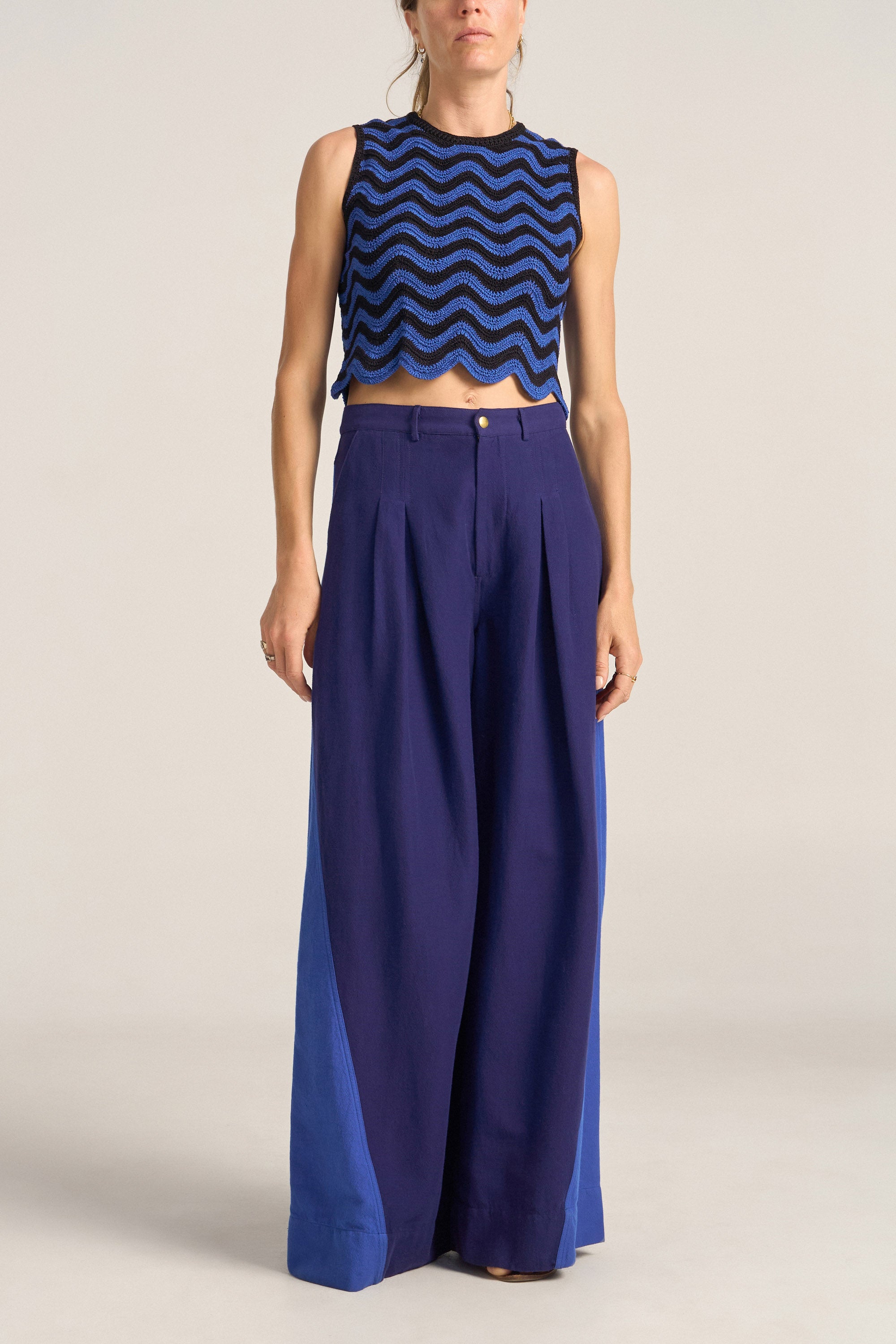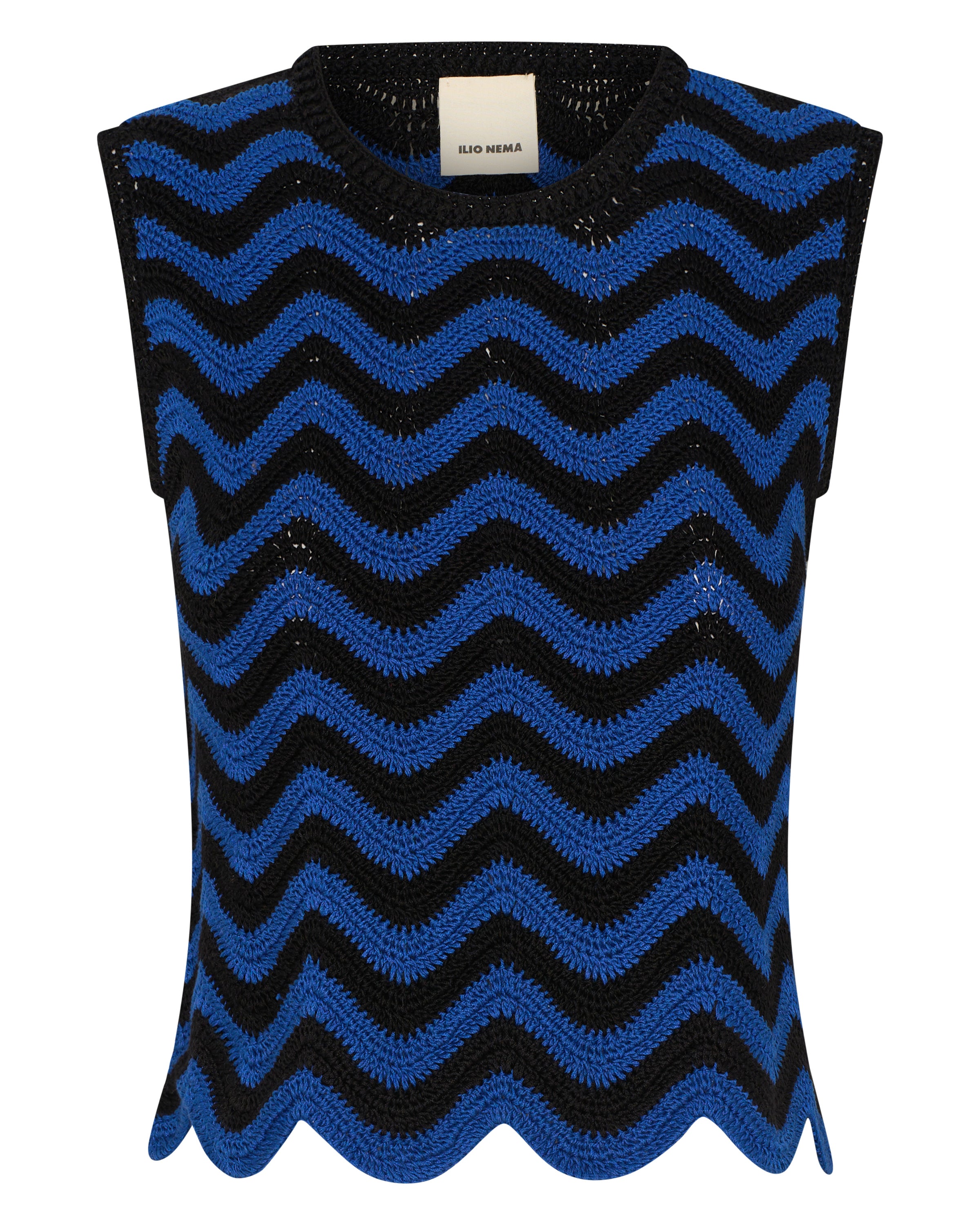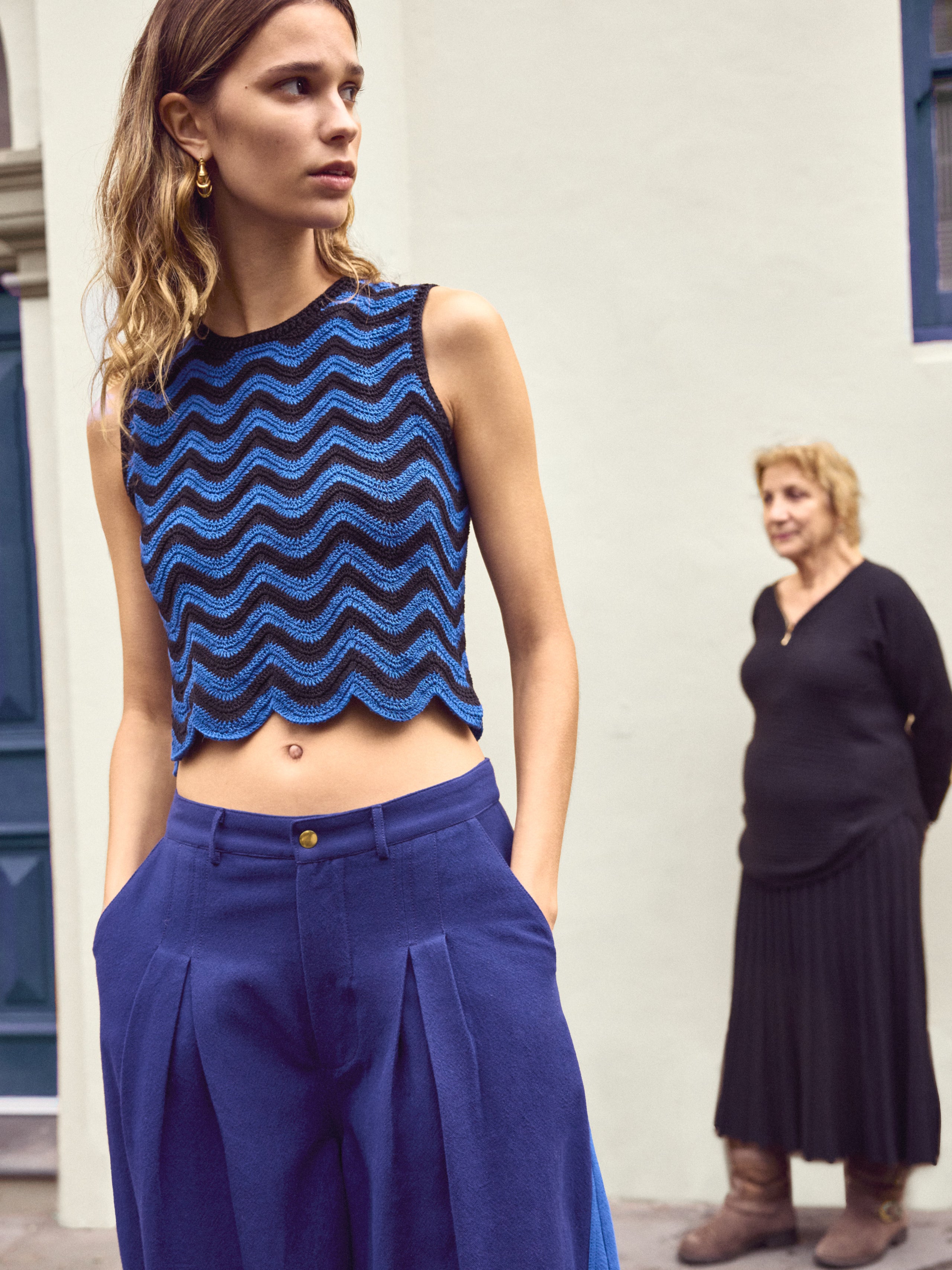 The Cynthia Top is a hand-crocheted cropped singlet featuring bold horizontal wave like stripes in rich black and deep blue. Entirely hand made in Peru, in the finest Pima cotton, with a lightweight and textured finish, this piece offers a refined and playful take on artisanal craft. Effortless and versatile, the Cynthia is perfect worn as a set with the Delphi skirt.
