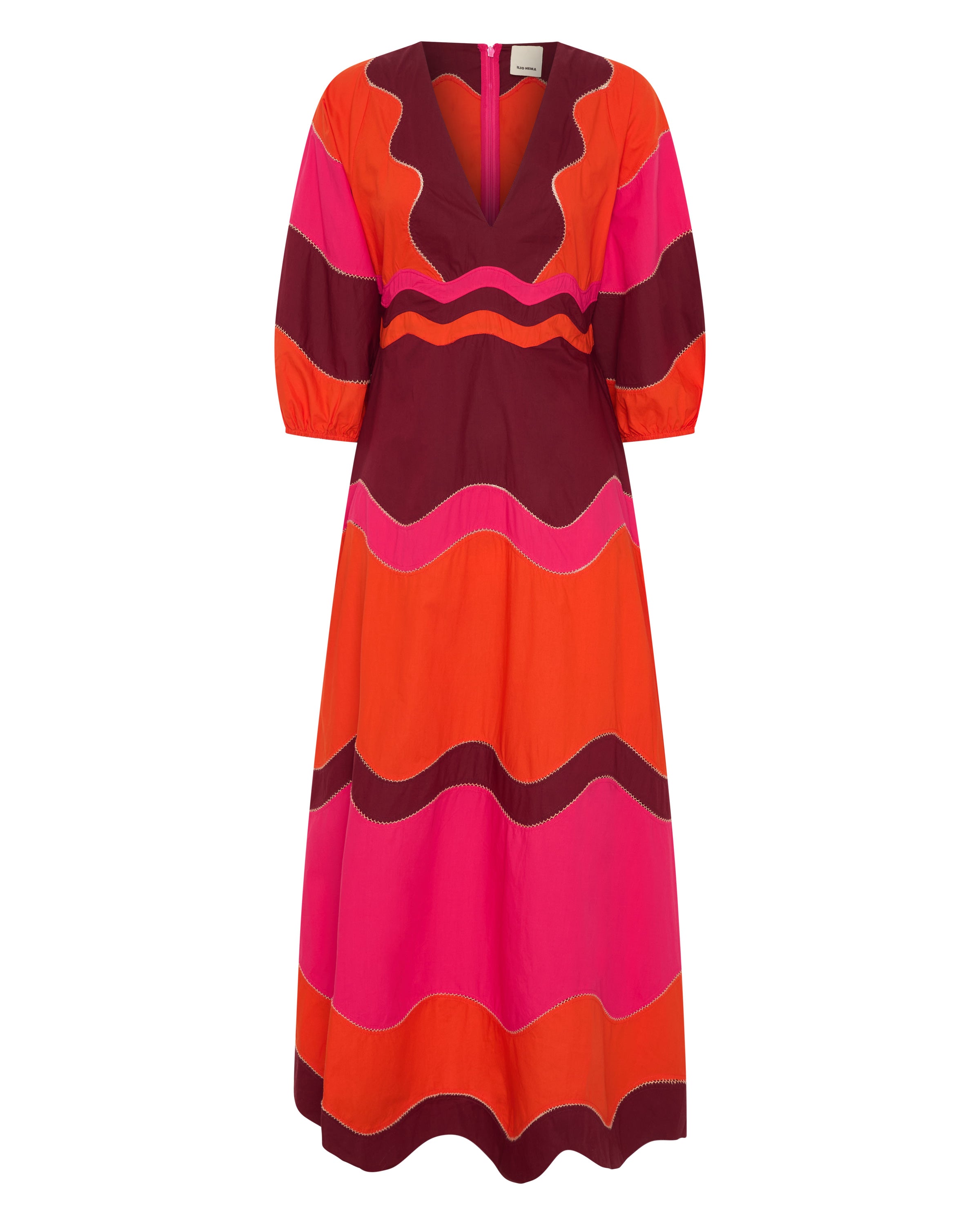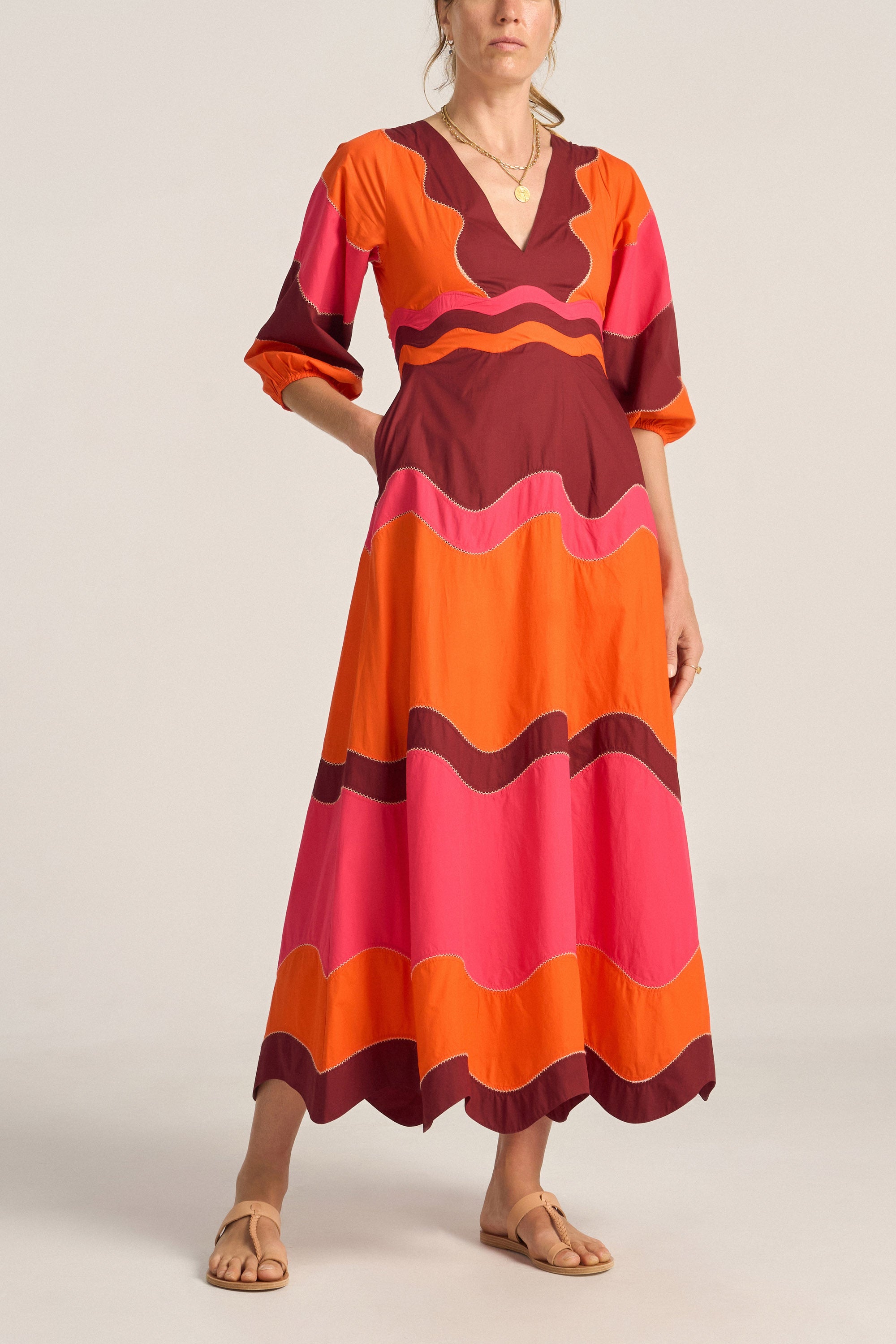 The Dryope Dress is a harmonious blend of structure and softness, crafted in crisp and vibrant cotton poplin. Bright colours are patchworked together in a wave pattern, with contrast handstitching, a true labour of love. Featuring a flattering V-neckline and mid-length bubble sleeves, with a fitted bodice and a full skirt, the dress is finished with a discreet back zip for ease of wear. A gentle wave hemline that adds movement and whimsy. Effortlessly elegant and versatile, the Dryope Dress brings artisanal charm and sunlit sophistication to your wardrobe.