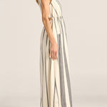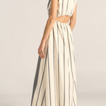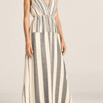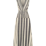 The Eirene Dress is a classic silhouette with a feminine edge. Crafted in our signature black and white broken stripe, it is a true labour of love—meticulously woven one thread at a time, by our artisans in India on traditional handlooms, each piece takes days to complete. This sleeveless style features a flattering V-neckline, an elasticated waistband that softly cinches the body, and a peek-a-boo detail at the back waist for a touch of skin. Long length, the flowy skirt features side pockets and side slits to allow for ease and movement, making this dress a perfect piece for warm, sun-filled days. A celebration of craftsmanship and slow fashion for modern life.