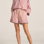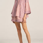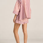 Relax into effortless style with the Halcyon Shirt, an oversized silhouette designed for laid-back sophistication. Featuring a subtle mix of red and white stripe paneling alongside red and blue stripes, this buttoned down shirt blends classic tailoring with a fresh, artisanal edge. Perfectly roomy and endlessly versatile with its wide cropped sleeves, the Halcyon Shirt is your go-to piece for easy pairing with the Talus Shorts.