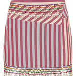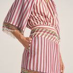 The Hymen Skirt is a playful mini that brings a fresh, modern edge to classic craftsmanship. Tailored in the bicolour Oia Stripe—featuring a warm palette of red, cream, and blue—with intricate beading along the waist and hemline, this skirt is an artful artisanal gem. A discreet back zip ensures ease of wear. Designed to mix and match effortlessly with the Harpies Top, the Hymen Skirt is a statement piece that will also pair easily with any tops.