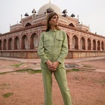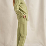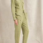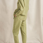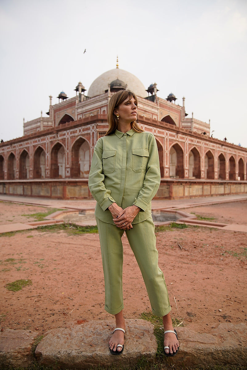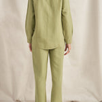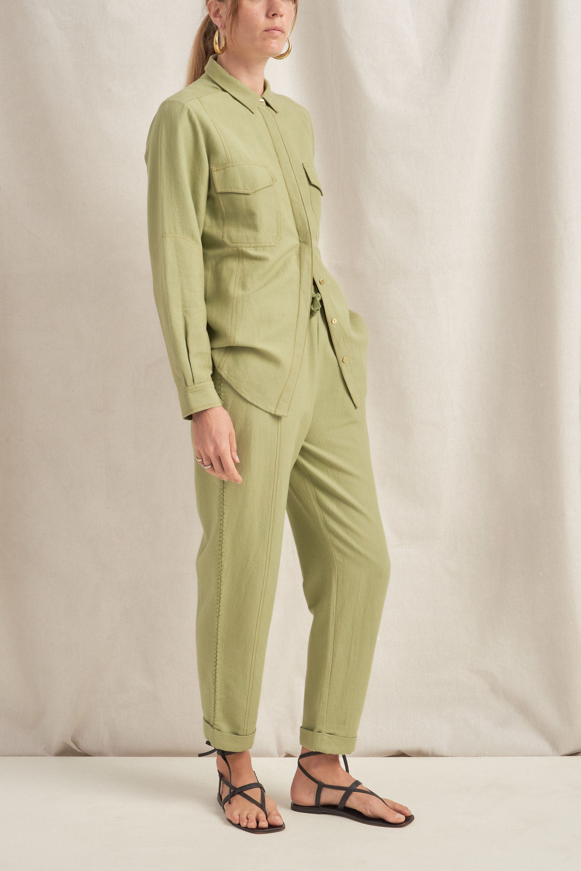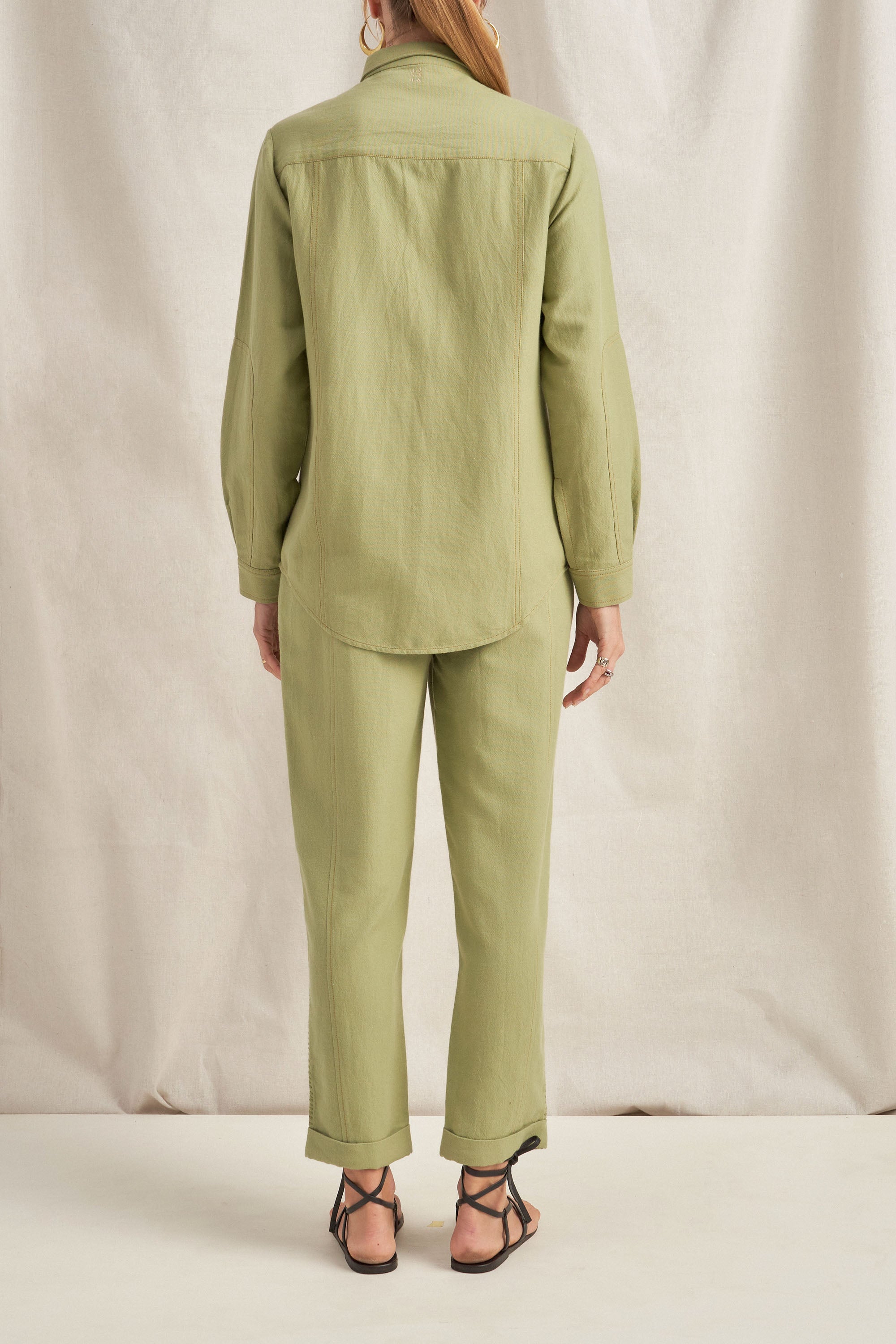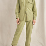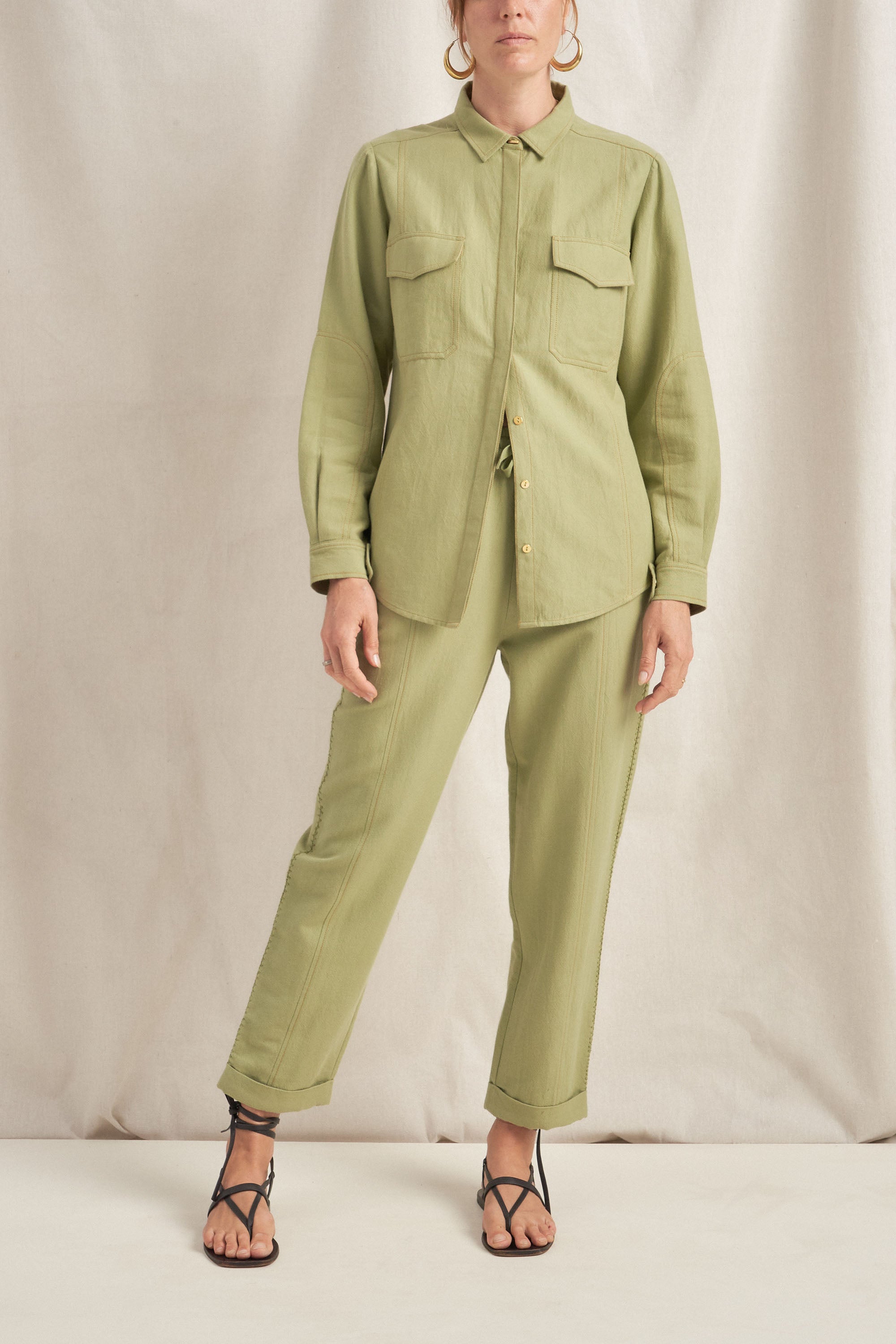 The Paris Shirt is the perfect essential for your wardrobe. In a sage hue with camel contrast stitching this piece has a military touch. Designed for a tailored fit with a long-line silhouette it features a button-down front with gold snaps at the neckline and cuffs. This timeless shirt can be worn back with the Cadmus Pants for a matching set.