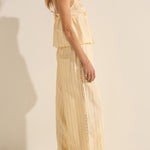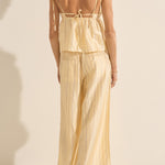 The Pellias Pants are simultaneously comfy and elegant. Tailored in a lightweight silk stripe with lace inserts running down the side for a delicate peek-a-boo effect. Featuring an elastic waistband, side pockets, and back patch pocket, they can be worn with the Arion Shirtdress for a matching set. They are our favourite versatile pants, for all occasions!