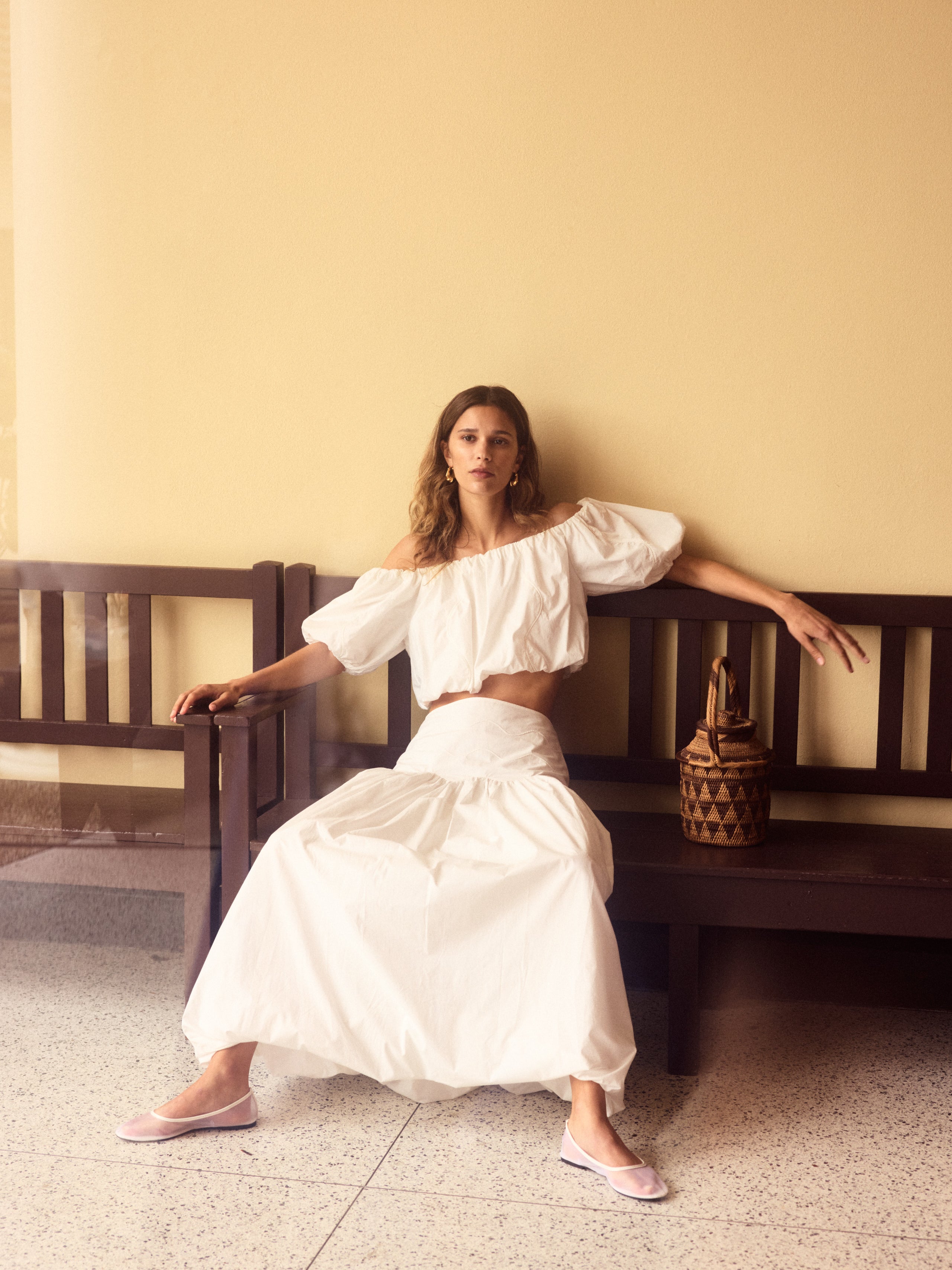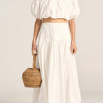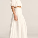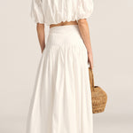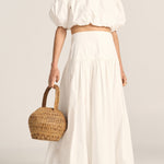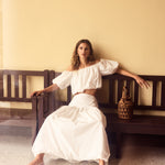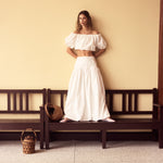 The Arachne Skirt is a refined yet sculptural silhouette, crafted in crisp white cotton poplin. Panels are joined with delicate wave-like crochet detailing, adding a soft artisanal touch to the clean structure. Fitted through the low hip, the skirt opens into voluminous pleats that cascade to a full maxi length, creating dramatic movement with every step. A discreet invisible side zip ensures ease of wear, while the striking blend of structure and craft brings elevated texture to your summer wardrobe. Pair with the Antiope Top for an effortless look.