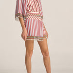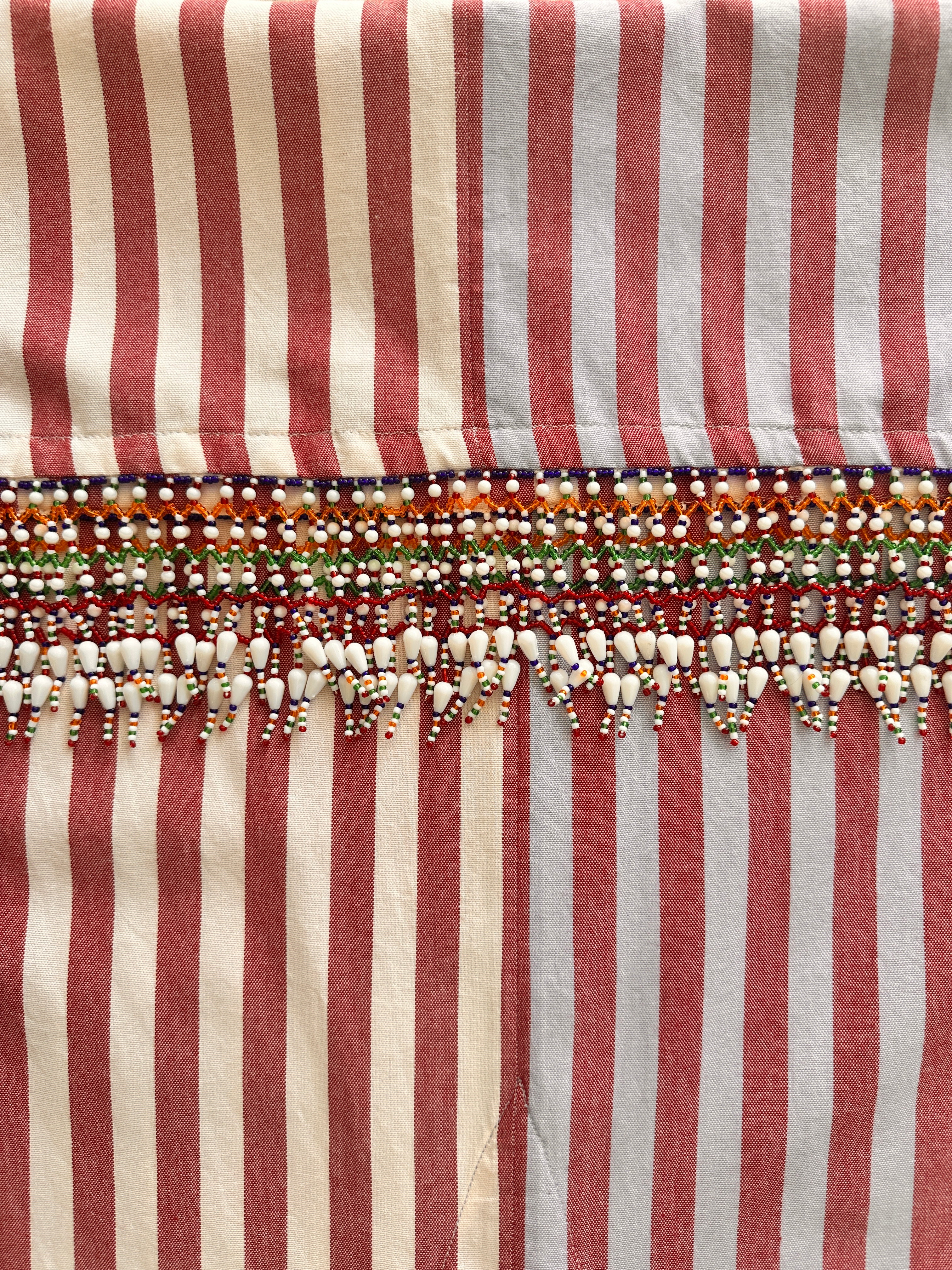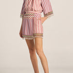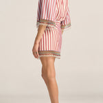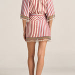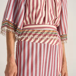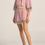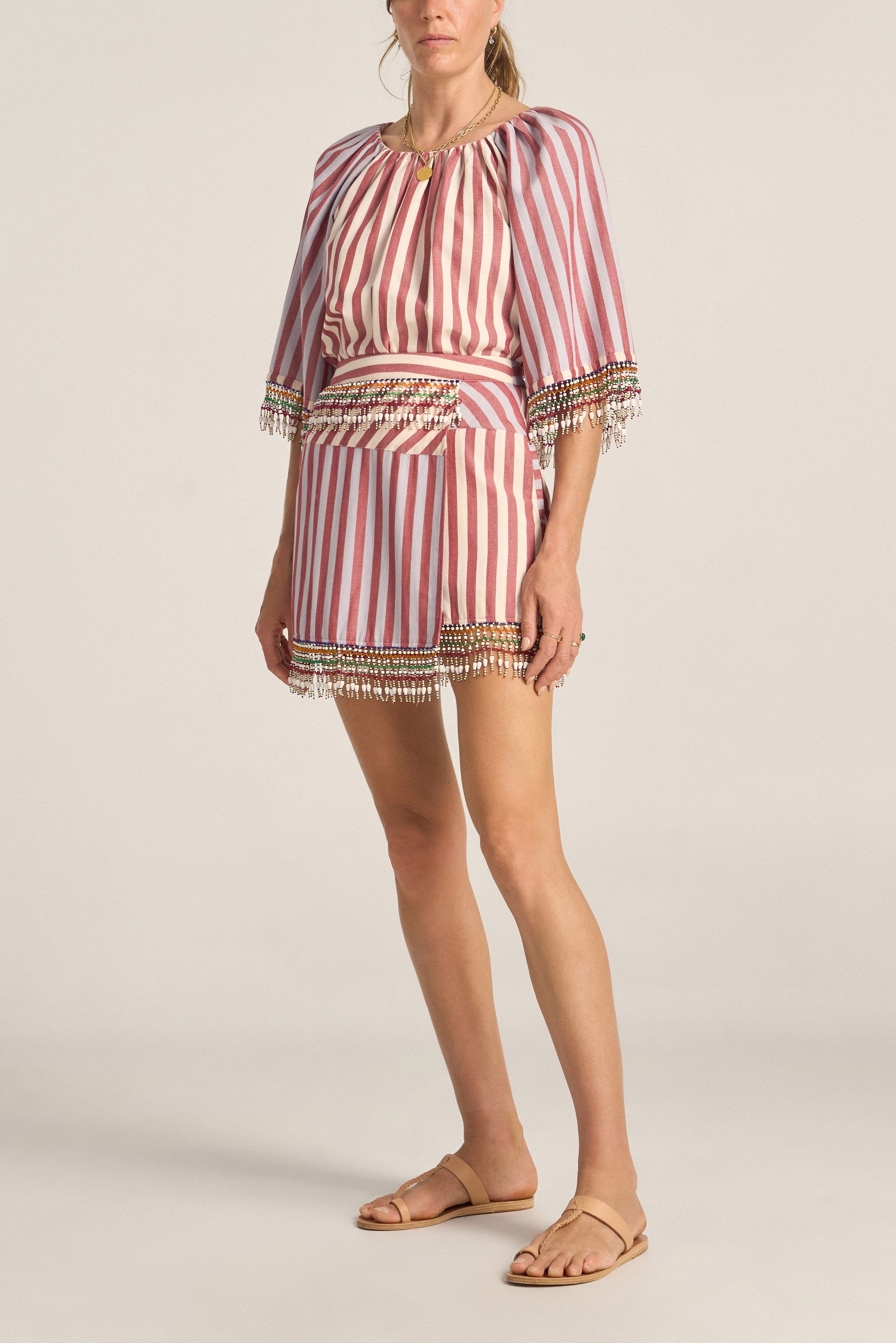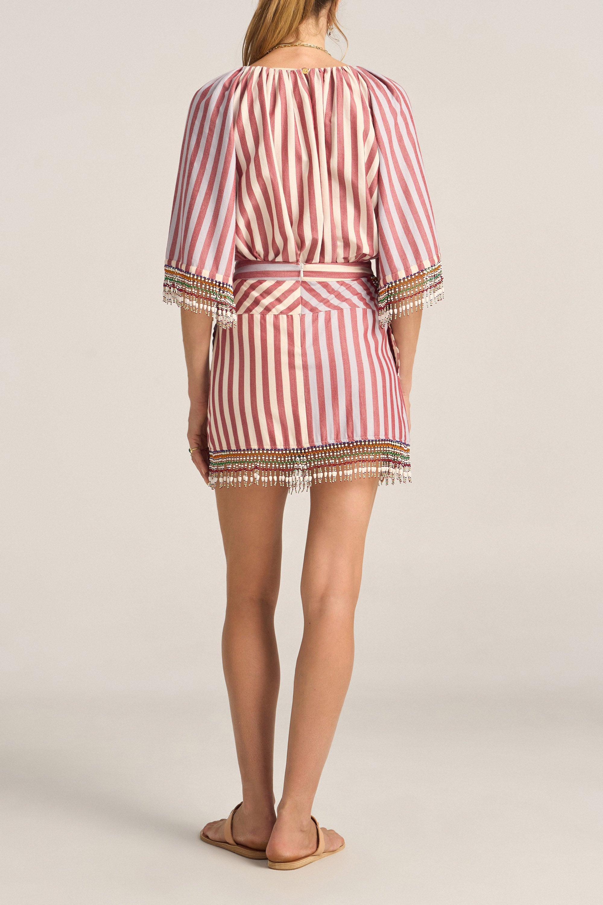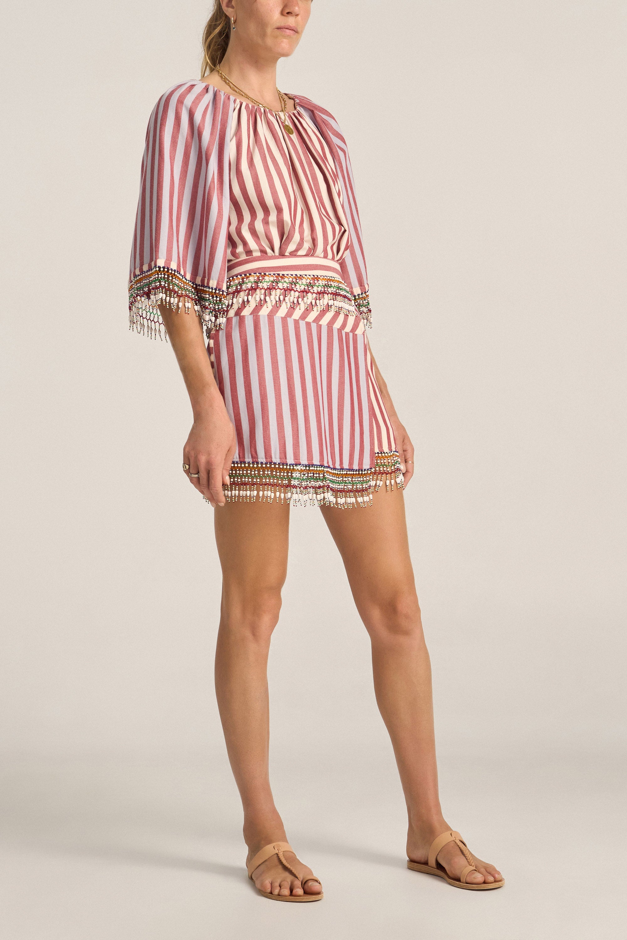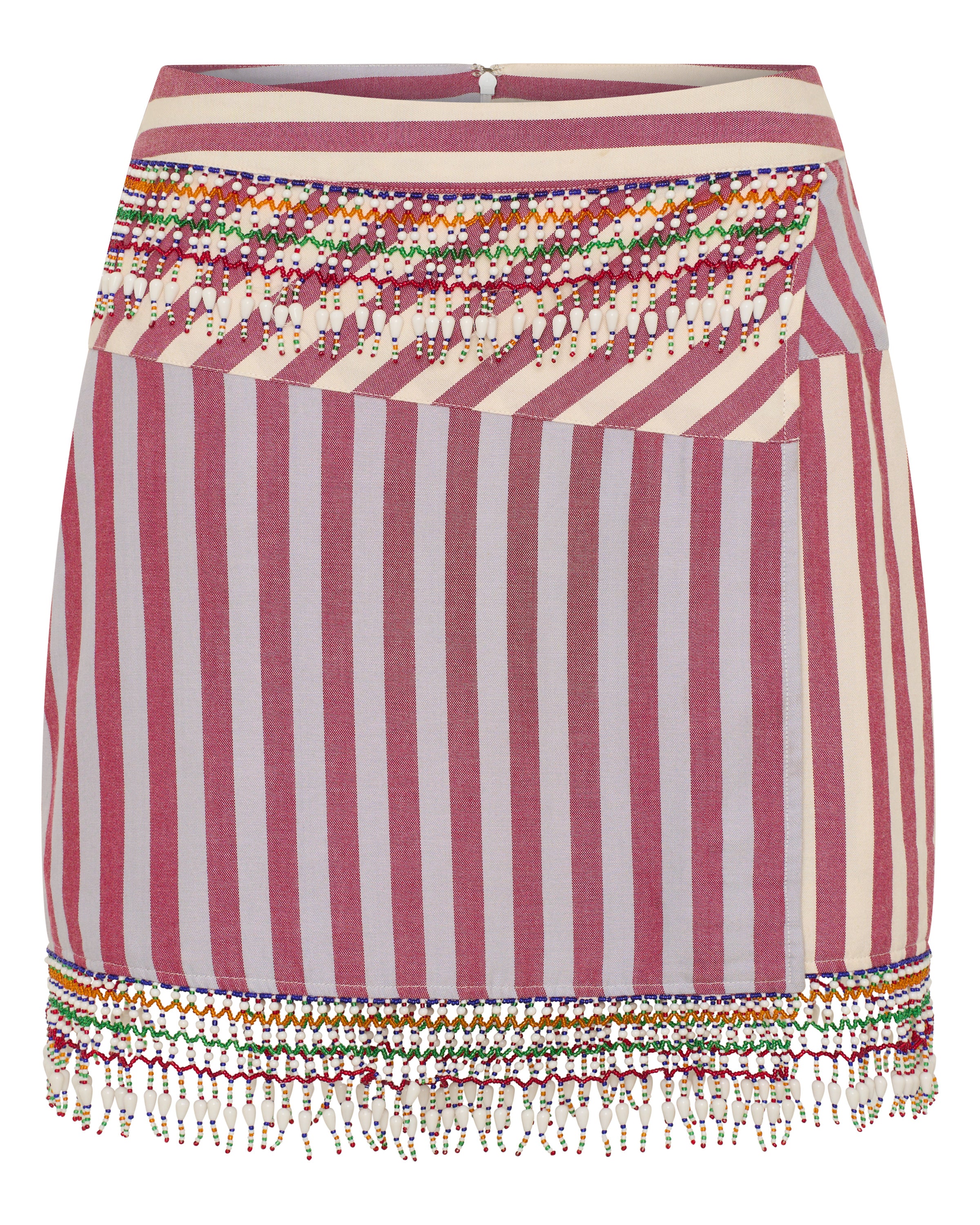The Hymen Skirt is a playful mini that brings a fresh, modern edge to classic craftsmanship. Tailored in the bicolour Oia Stripe—featuring a warm palette of red, cream, and blue—with intricate beading along the waist and hemline, this skirt is an artful artisanal gem. A discreet back zip ensures ease of wear. Designed to mix and match effortlessly with the Harpies Top, the Hymen Skirt is a statement piece that will also pair easily with any tops.
