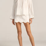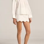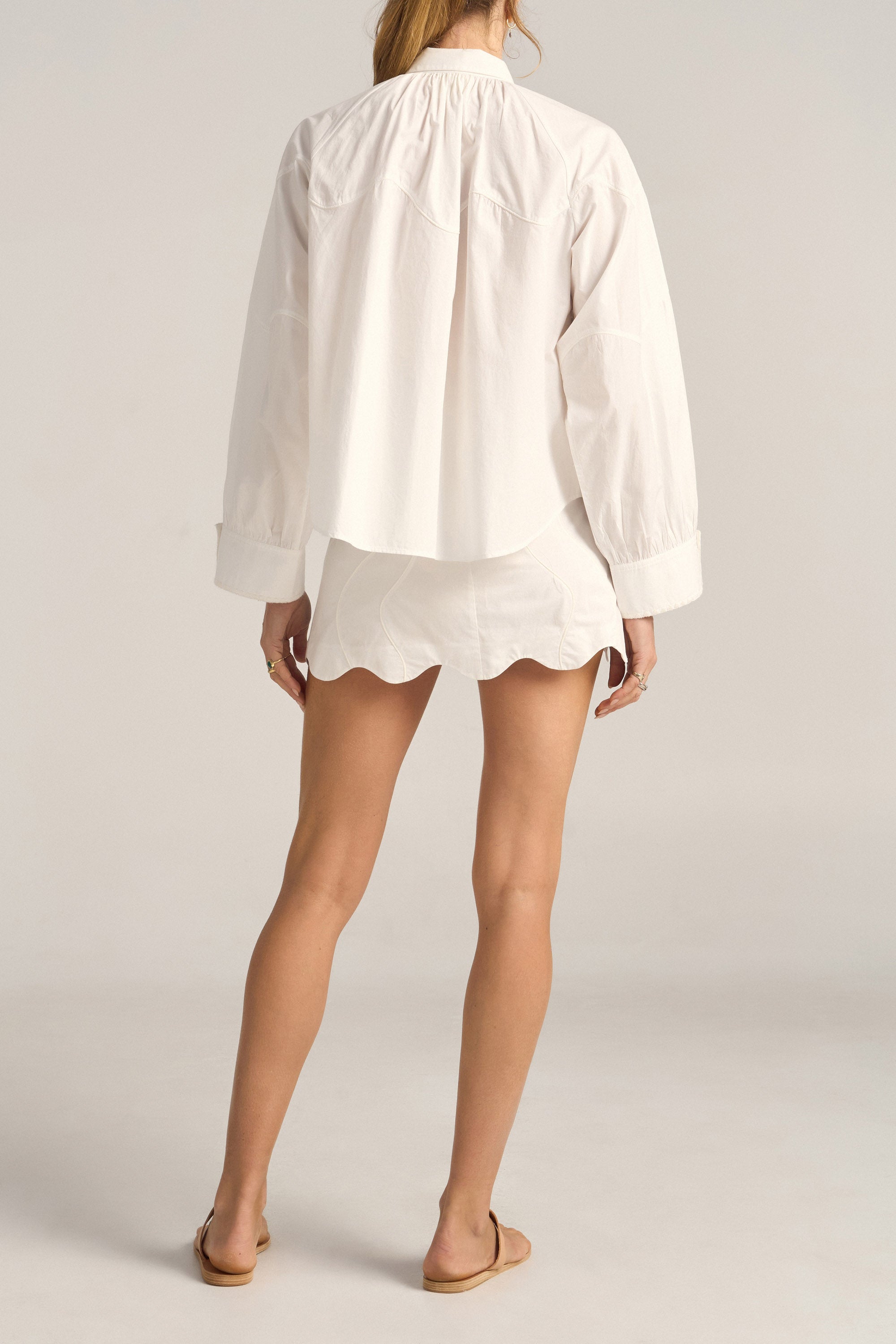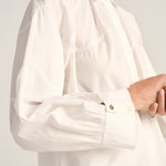The Cleobis Shirt is a modern interpretation of classic shirting, crafted in crisp white cotton poplin. Designed with a clean collar and a single rectangular gold button at the neckline, the shirt features structured paneling through the high neck and shoulders, creating gentle volume. A delicate wave crochet insert at the mid-chest releases the silhouette into a soft, billowing shape that flows to the hem. With long sleeves and refined detailing, the Cleobis Shirt offers a fresh balance of structure and fluidity.