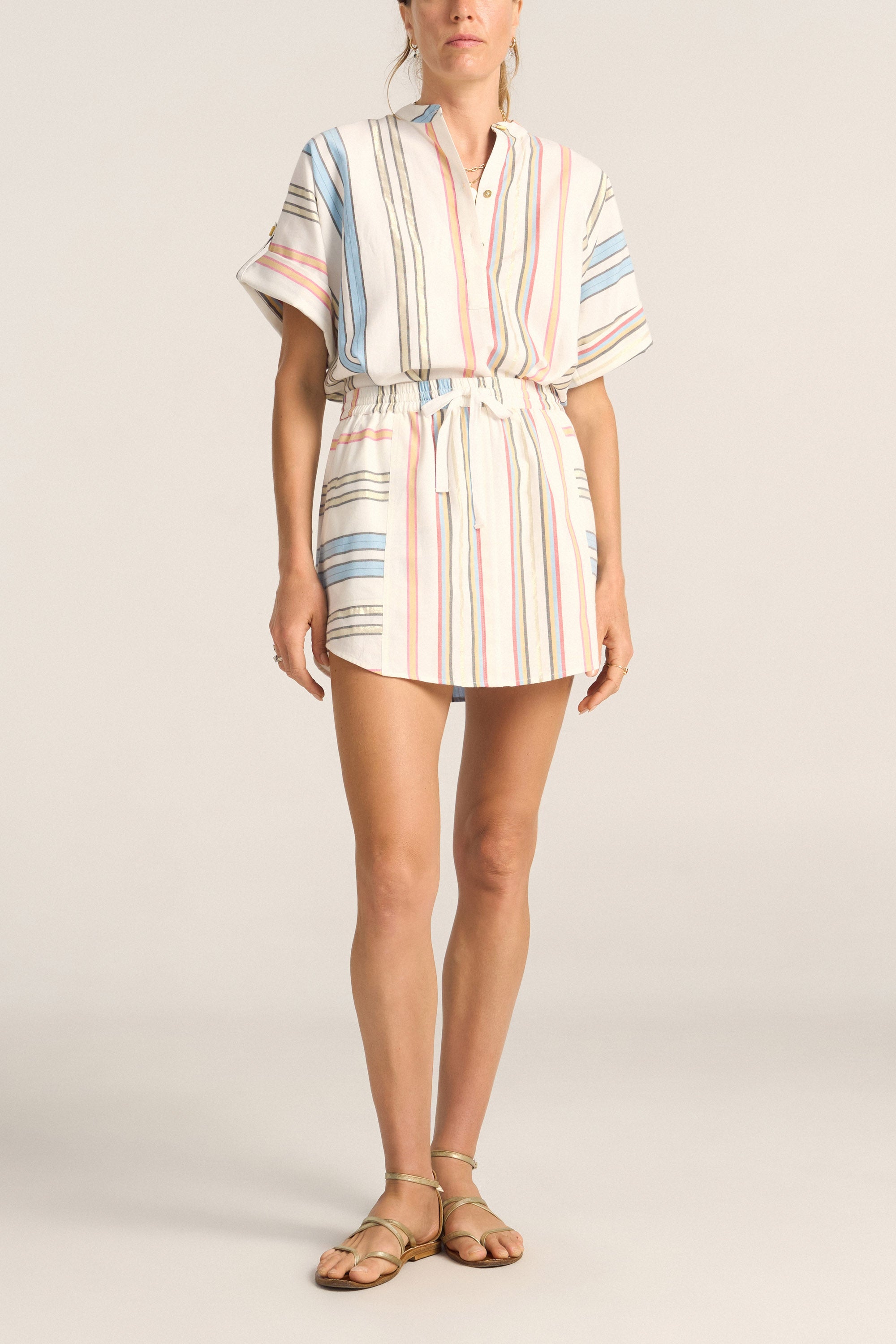 The Daphne Top is a relaxed yet polished staple, designed for effortless everyday wear. Cut in our breezy Byron Stripe, it features loose, short sleeves that are softly rolled and secured with a buttoned tab for a casual finish. A clean, collarless neckline and subtle gold buttons add a touch of understated elegance. Lightweight and versatile, the Daphne Top pairs perfectly with the Abas Skirt.