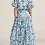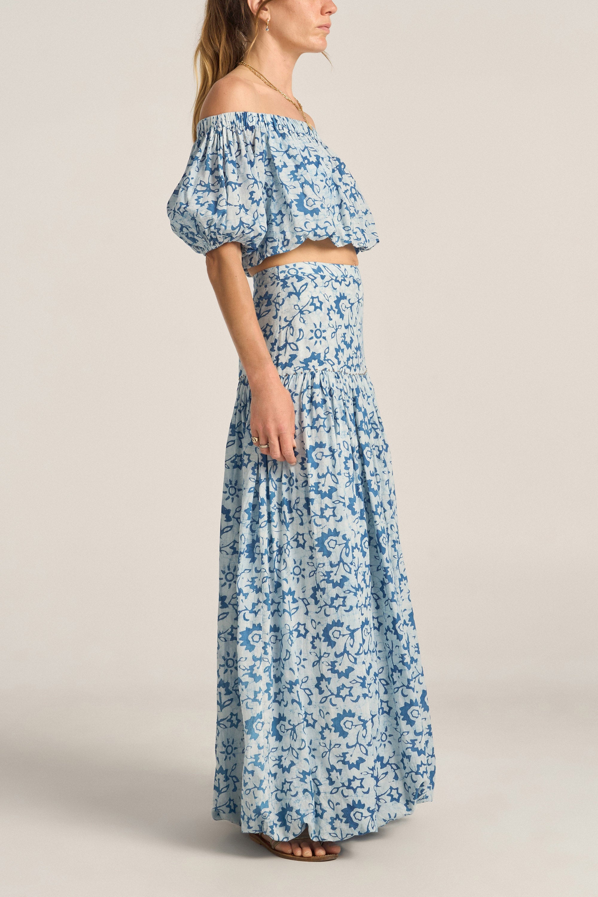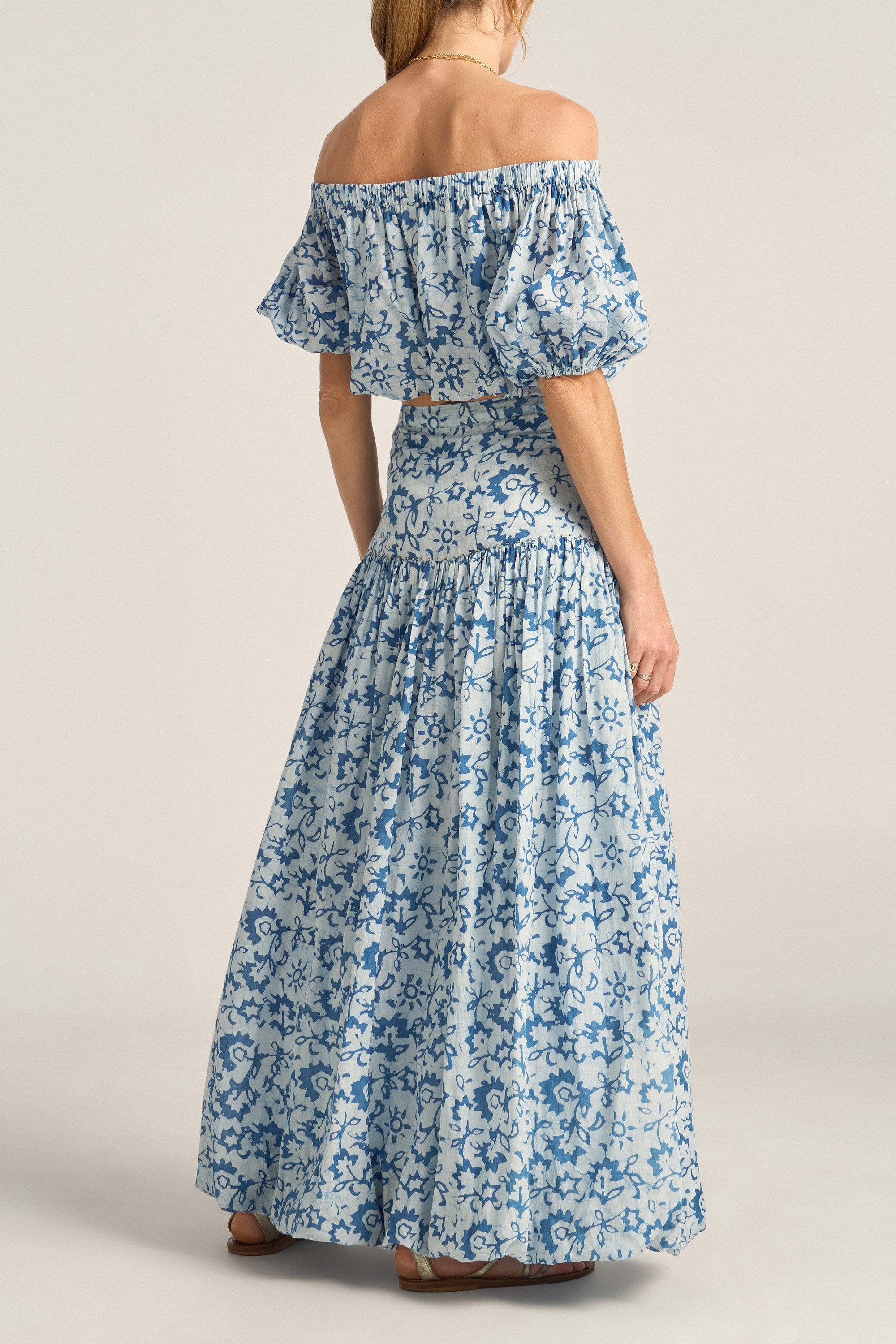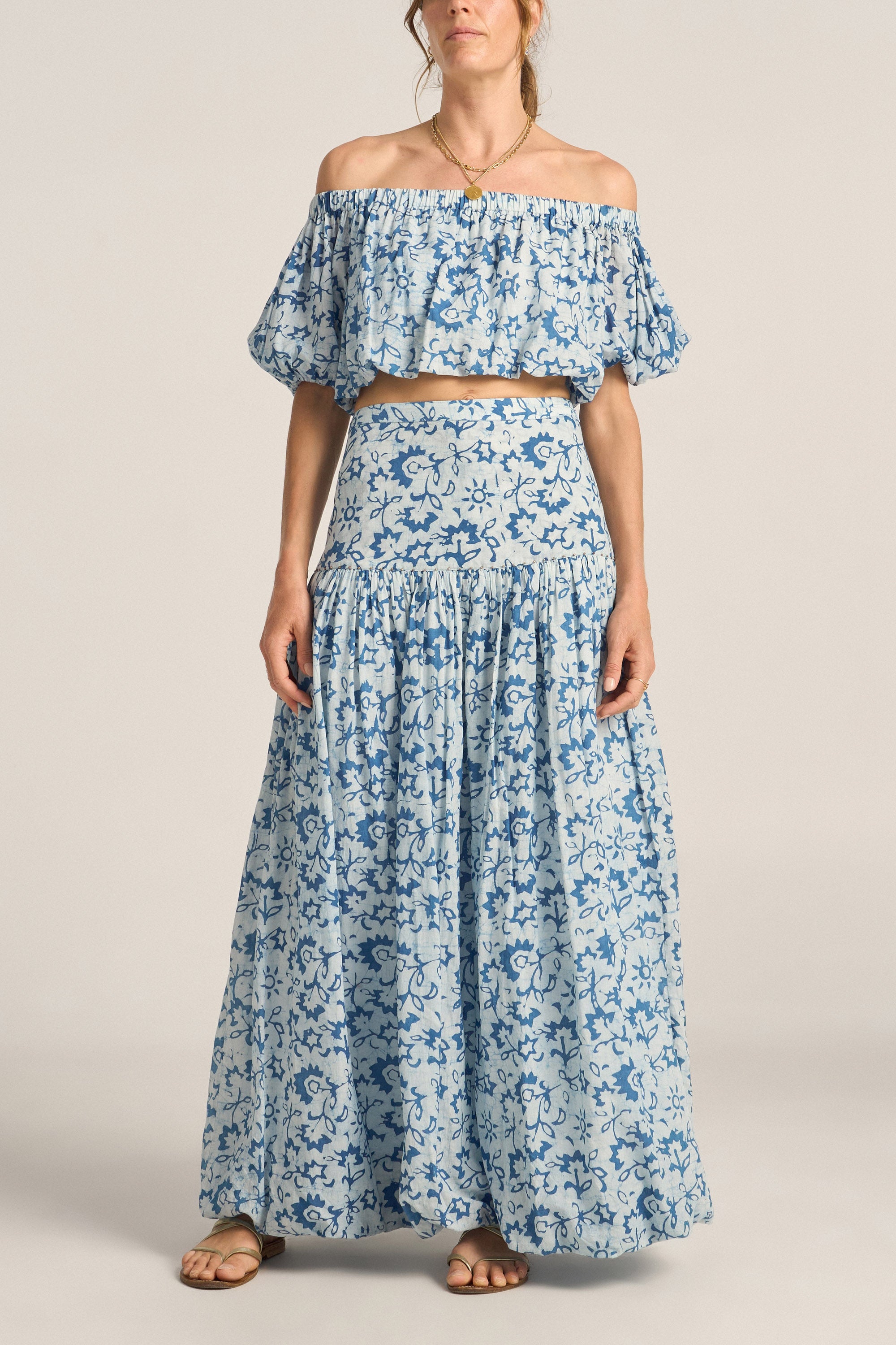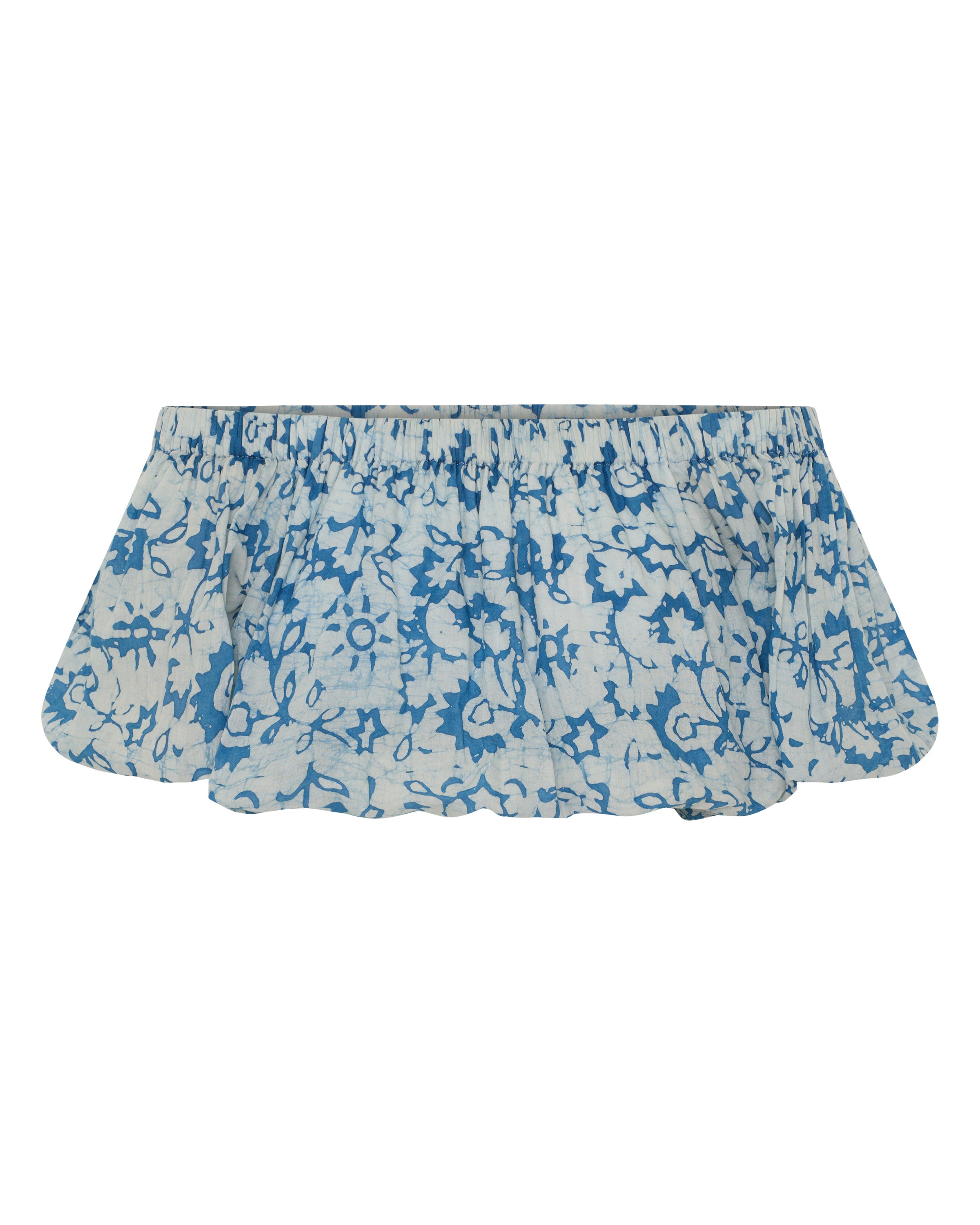 The Elli Top is a playful, summery statement crafted in a soft indigo batik printed voile. Featuring a bubble silhouette with voluminous puff sleeves and a cropped length, this top brings a whimsical touch to any outfits. Perfect for pairing with the Merope Skirt or with jeans, the Elli Top combines a artful feel with timeless artisanal craftsmanship.