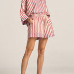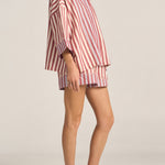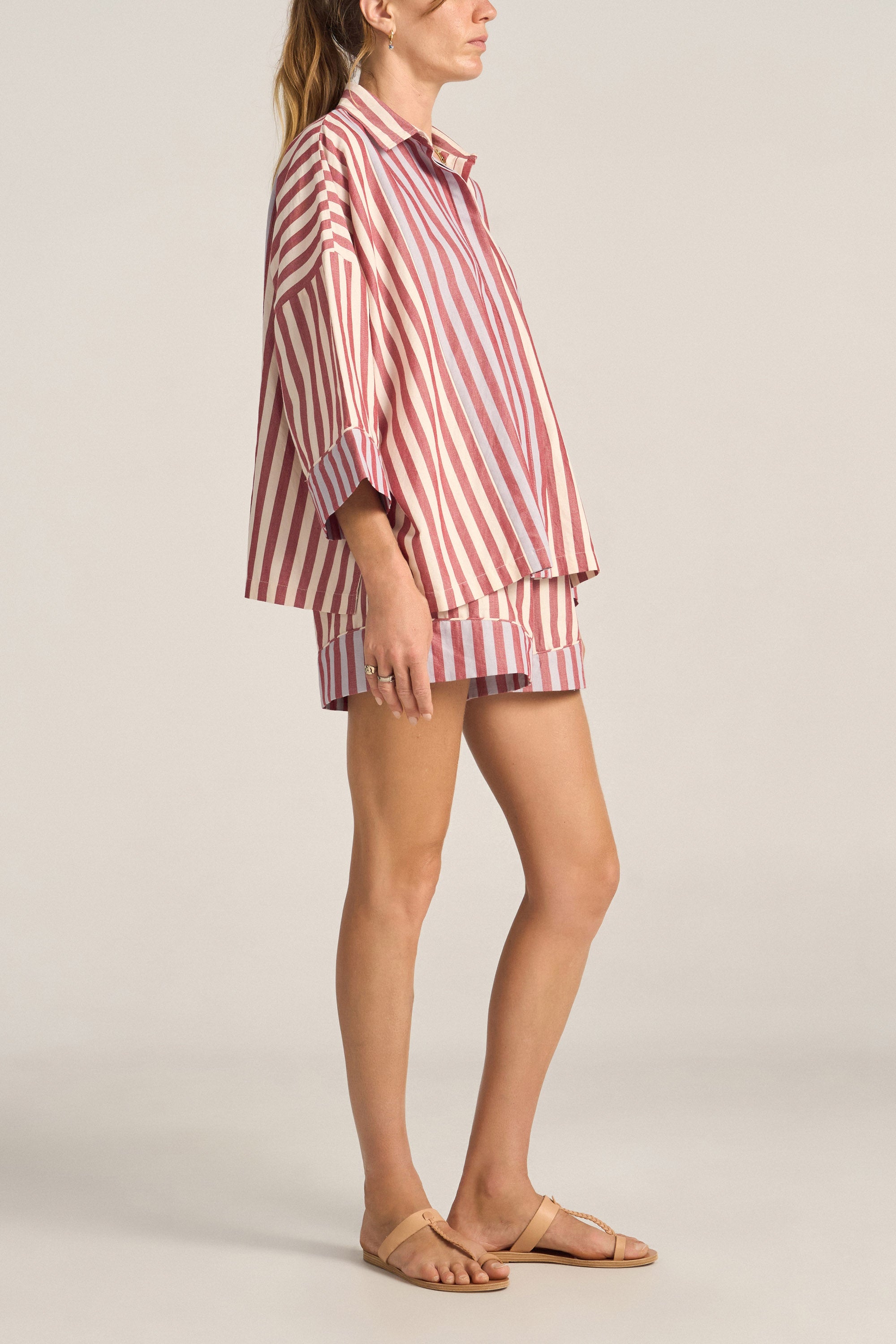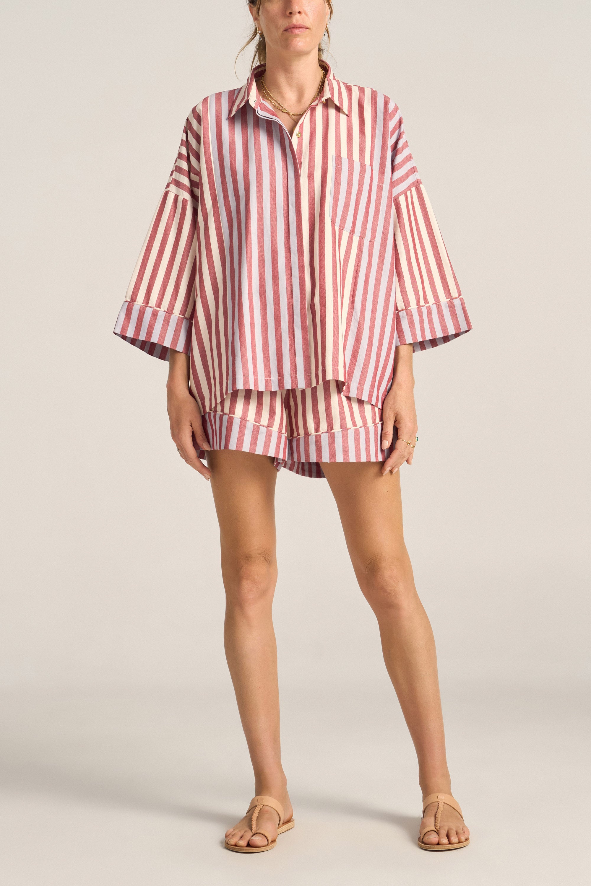 Relax into effortless style with the Halcyon Shirt, an oversized silhouette designed for laid-back sophistication. Featuring a subtle mix of red and white stripe paneling alongside red and blue stripes, this buttoned down shirt blends classic tailoring with a fresh, artisanal edge. Perfectly roomy and endlessly versatile with its wide cropped sleeves, the Halcyon Shirt is your go-to piece for easy pairing with the Talus Shorts.