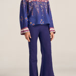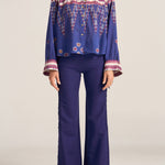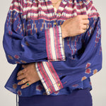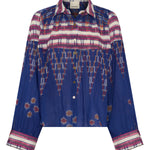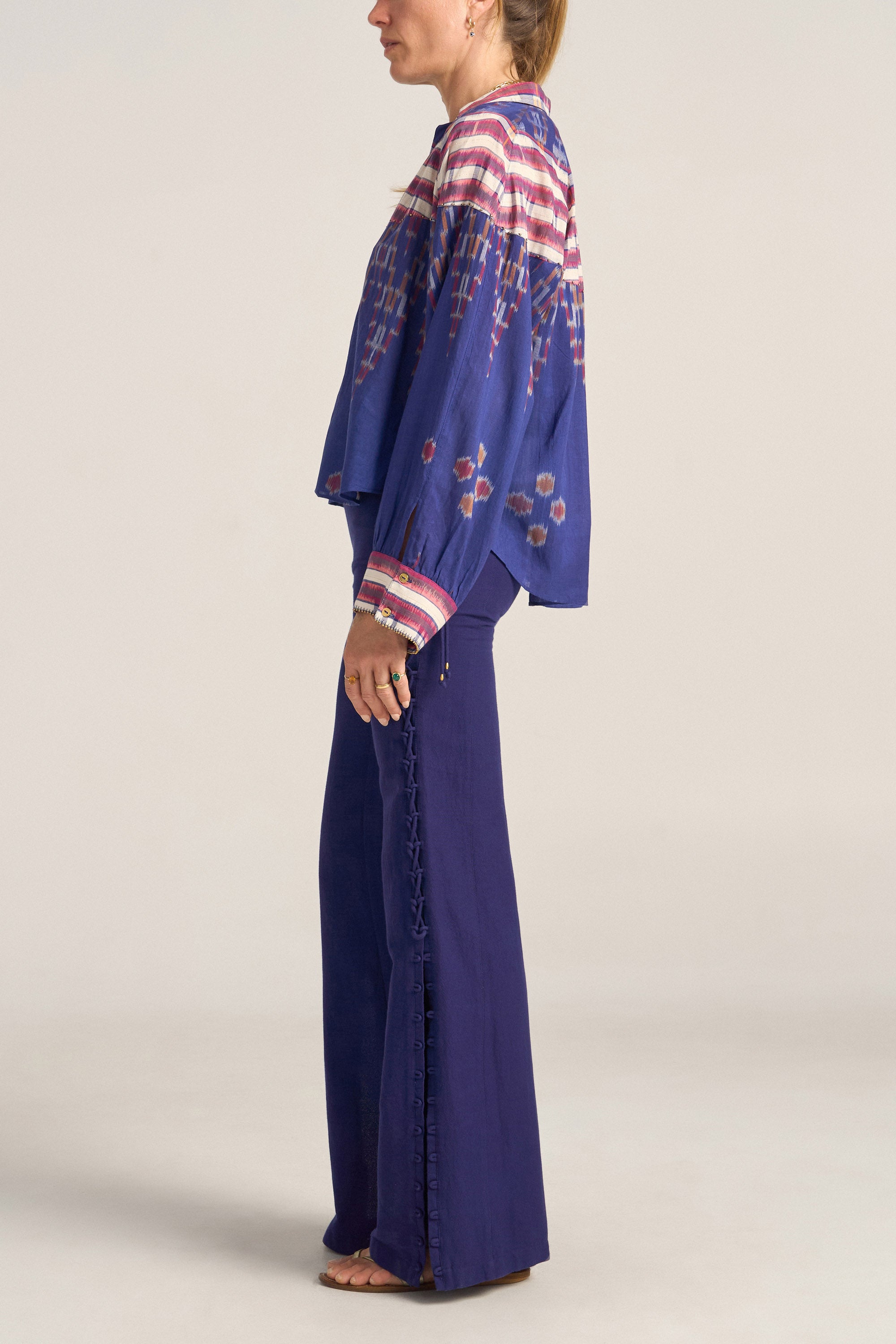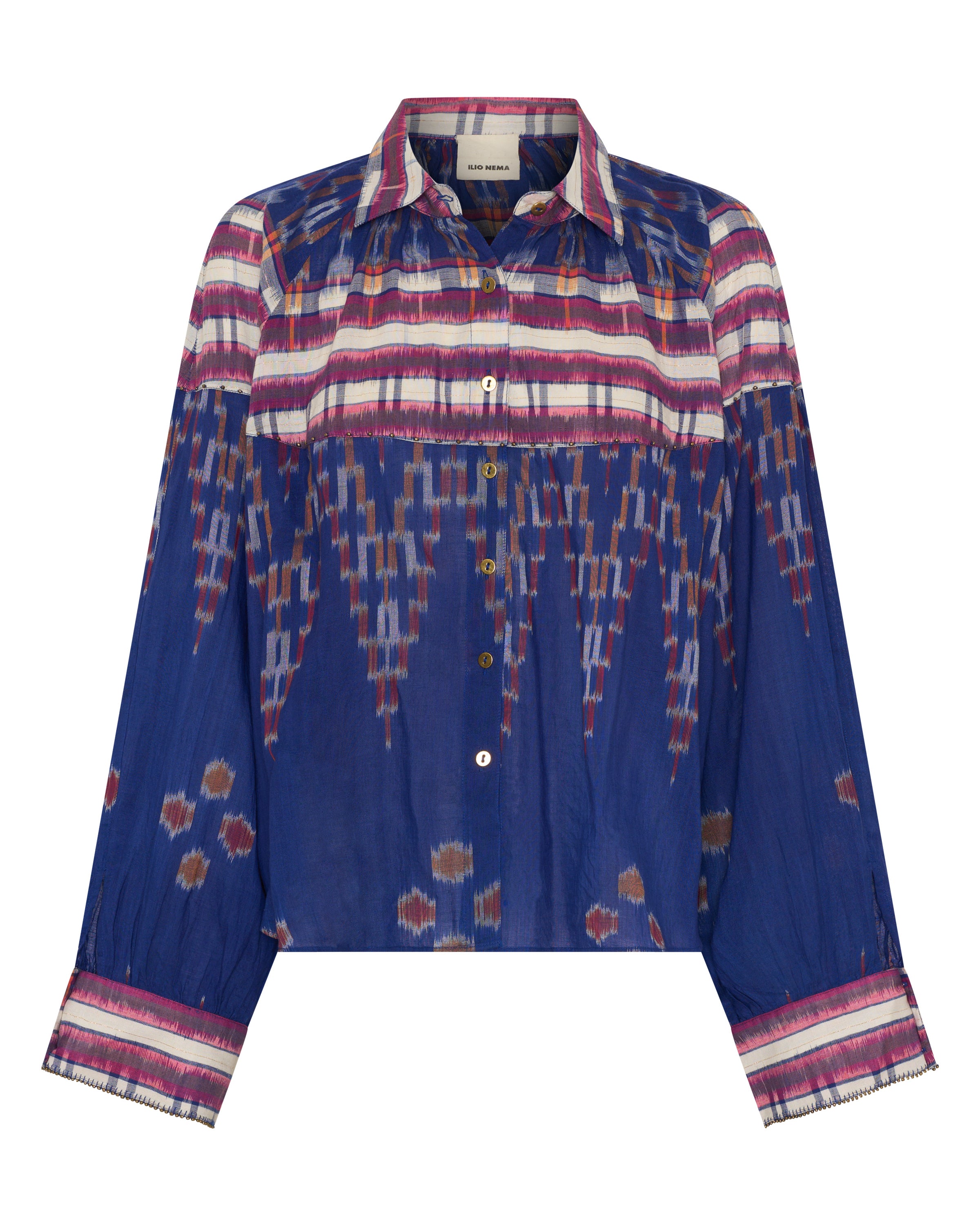 The Medusa Shirt is crafted from a luxurious cotton Ikat fabric with gold accents. This button-down, long-sleeve shirt features delicate gathering at the neckline that creates gentle flair across the chest. The sleeves are slightly oversized for a modern appeal, and subtle gold beading adorns the chest yoke seam and cuffs, adding an elegant, handcrafted shimmer. With its sophisticated silhouette and artisanal details, the Medusa Shirt elevates everyday dressing with a touch of timeless charm.