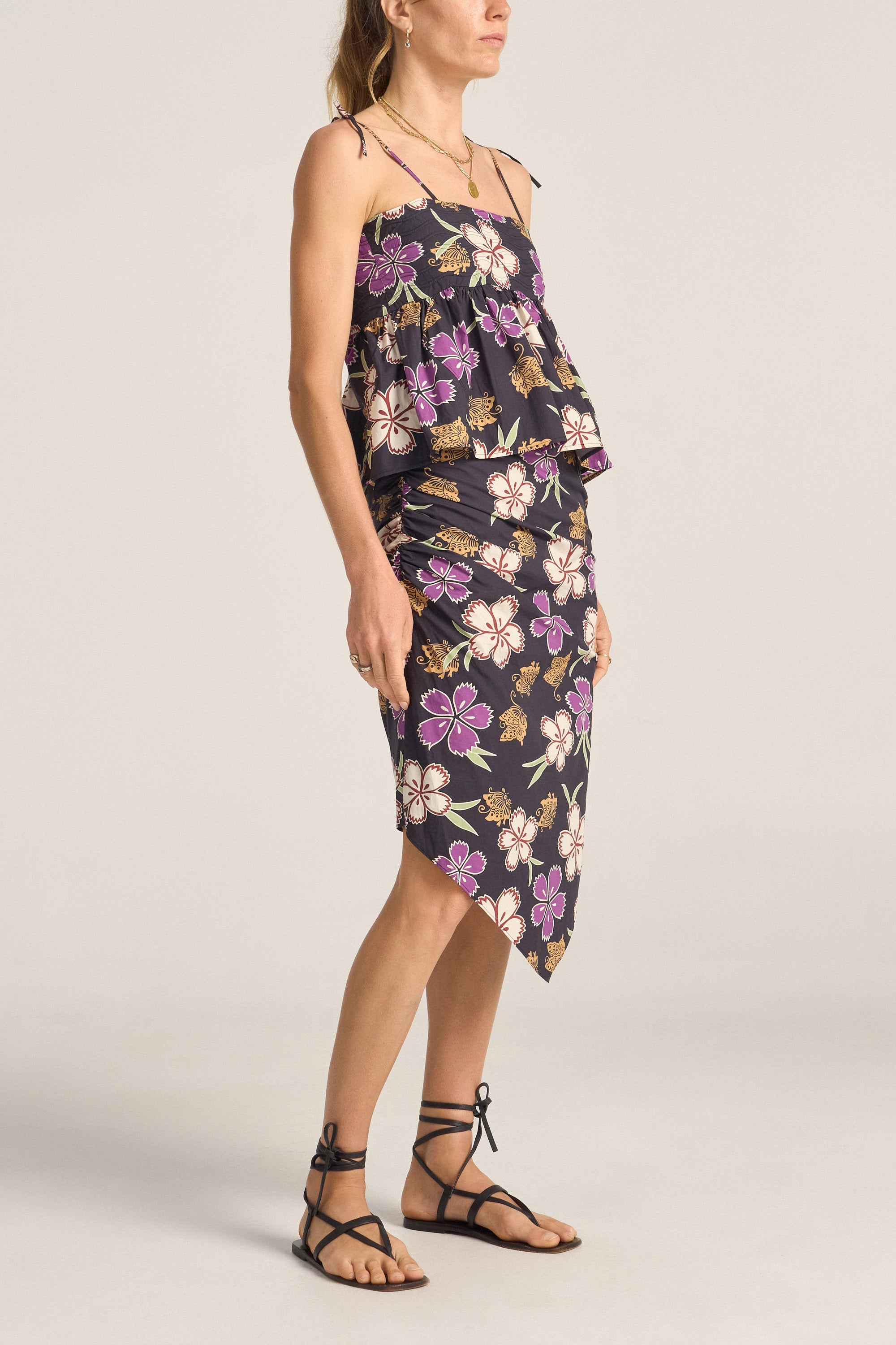 The Pronce Top is an airy, effortless tank top crafted from a vibrant hibiscus printed cotton poplin. Featuring delicate shoulder ties, a fitted bustier with wavy seaming details and a smocked back for an easy fit, it gently billows out to create a relaxed, flattering silhouette. Perfect for pairing with tailored trousers or flowy skirts, the Pronce Top brings a fresh tropical touch to your wardrobe.
