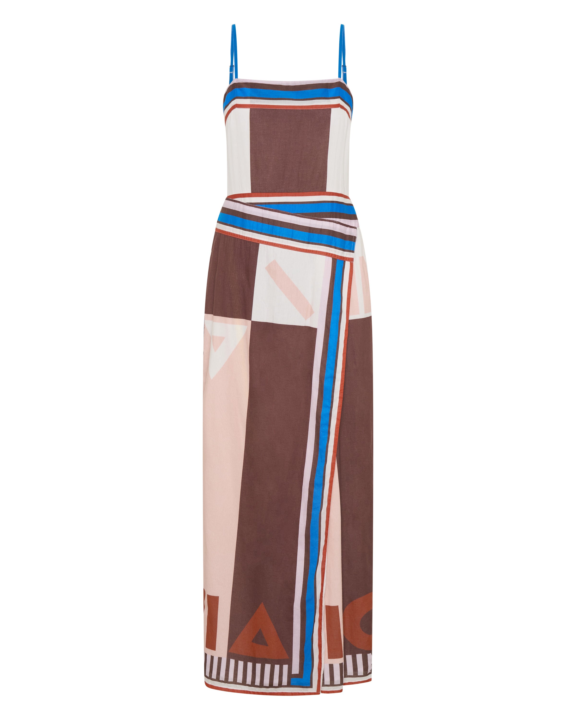 The Aethra Dress is a feminine silhouette that moves with ease and confidence. Crafted in our Sarong print, a warm blend of brown, pink and white tones. It features a straight neckline with fine adjustable shoulder straps and a softly ruched elastic back for comfort and easy fit. The bodice and waist are delicately fitted while the skirt is wrapping diagonally in the manner of a sarong, adding laid-back touch to an elegant look. Effortless yet refined, the Aethra Dress embodies relaxed elegance for sun-drenched days and balmy evenings alike.
