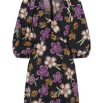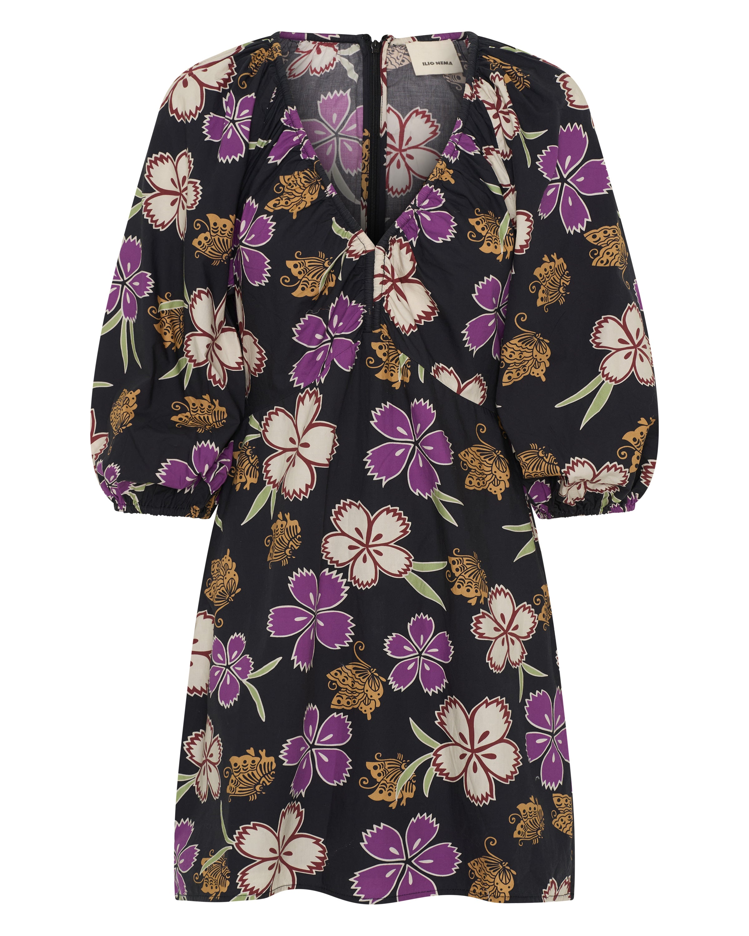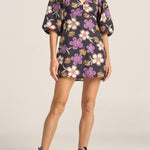 The Coeus Dress is a statement mini dress, crafted from a vibrant hibiscus printed poplin that blends deep purples and soft creams into a lush floral pattern. Featuring a flattering V-neckline, ruched fitted bodice, and softly puffed sleeves, this dress moves gracefully with you—perfect for both relaxed days and special occasions. A discreet back zip ensures ease of wear, while the lightweight, effortlessly chic design brings tropical beauty and effortless style to your wardrobe.