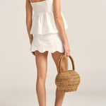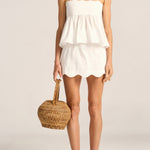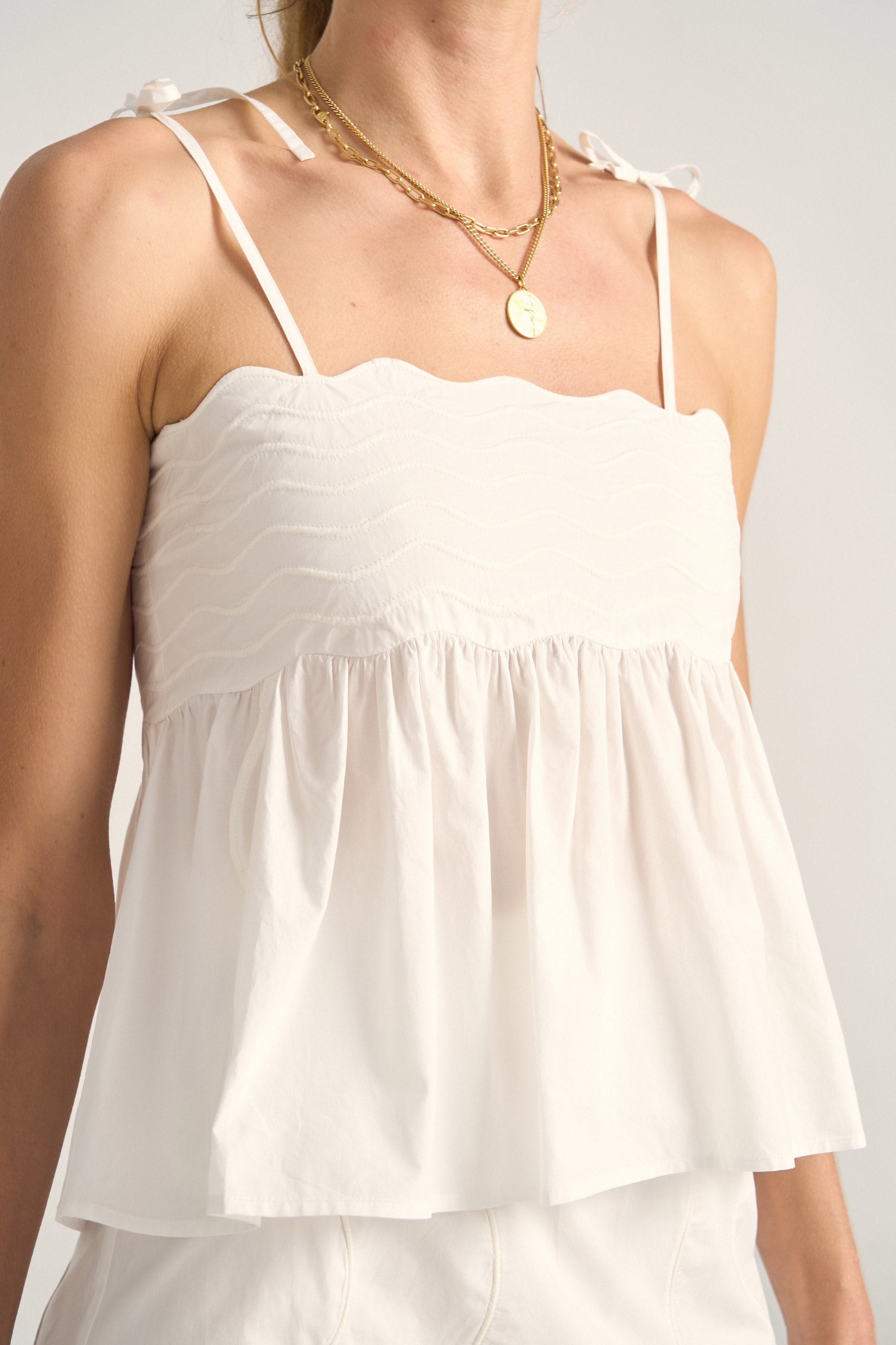 The Pronce Top is a light and airy essential, crafted from crisp white cotton poplin. The top features a fitted bustier with wavy seaming details and a smocked back for an easy fit, it gently billows out to create a relaxed, flattering silhouette. Perfect for pairing with tailored trousers or flowy skirts, the Pronce Top brings a fresh tropical touch to your wardrobe.